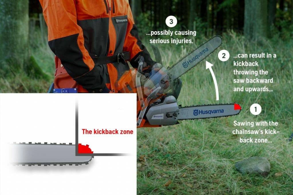 엔진톱을 사용하는 모든 근로자는 '킥백(Kickbacks)' 을 반드시 정확하게 알고 있어야 한다. 거짓말 조금 보태 대부분 대형 사고는 여기서 발생하기 때문이다. 킥백은 엔진톱 가이드바가 갑작스럽게 튀어 오르는 동작을 말하며 부상을 막기 위해선 정확한 엔진톱 사용법을 숙지해야 한다.