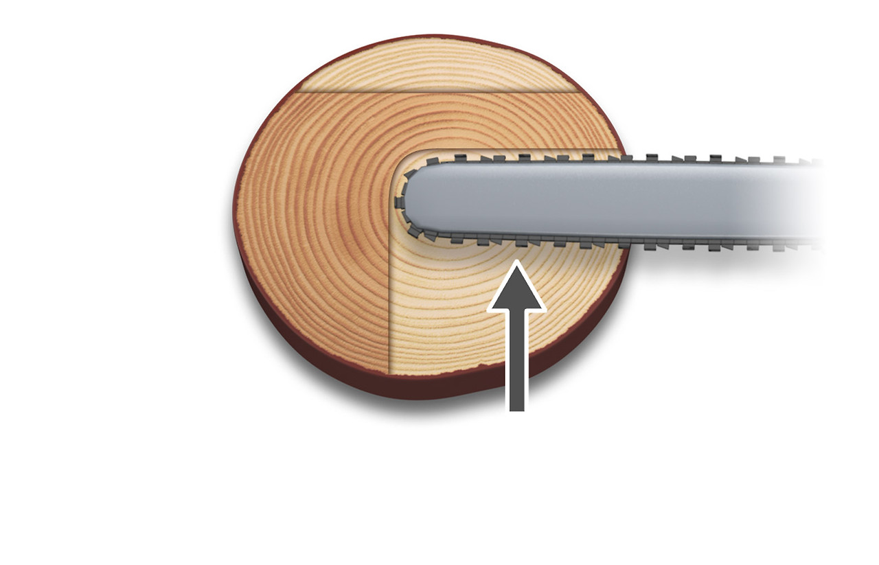 반대로 미는 톱날 방향인 가이드바 상단을 사용해 범퍼 스파이크 윗부분 팁을 고정하는 방식으로도 벨 수 있다. 하지만, 이는 톱질이 불규칙적으로 될 수 있을뿐더러 엔진에 큰 저항이 생긴다.
