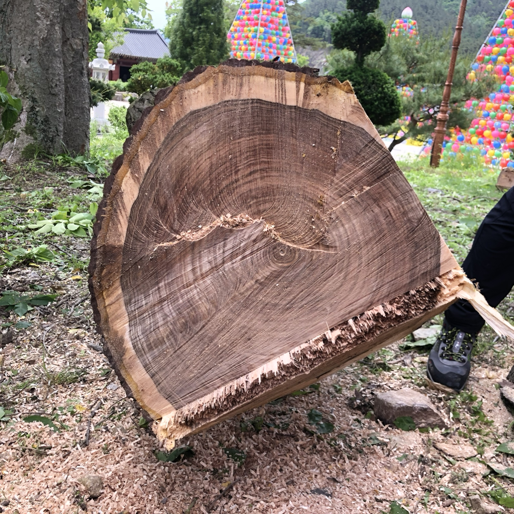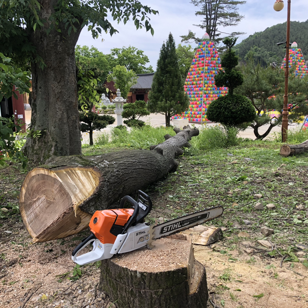 사용된 벌목도구를 피해 잘랐던 나무 높이보다 약간 낮게 톱질한다.