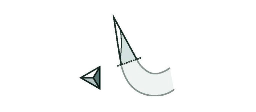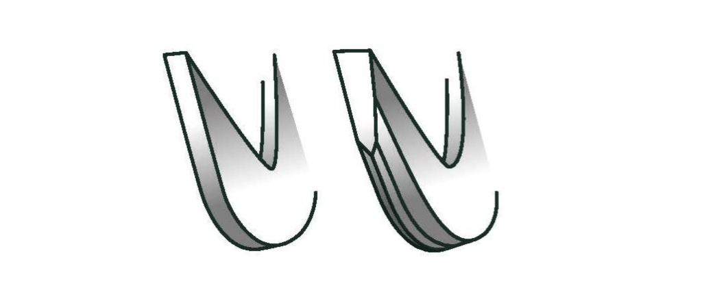 훅 측면으로부터 안쪽으로 연마한다. 팁이 앞으로 향하게 자연스럽게 유지한다.