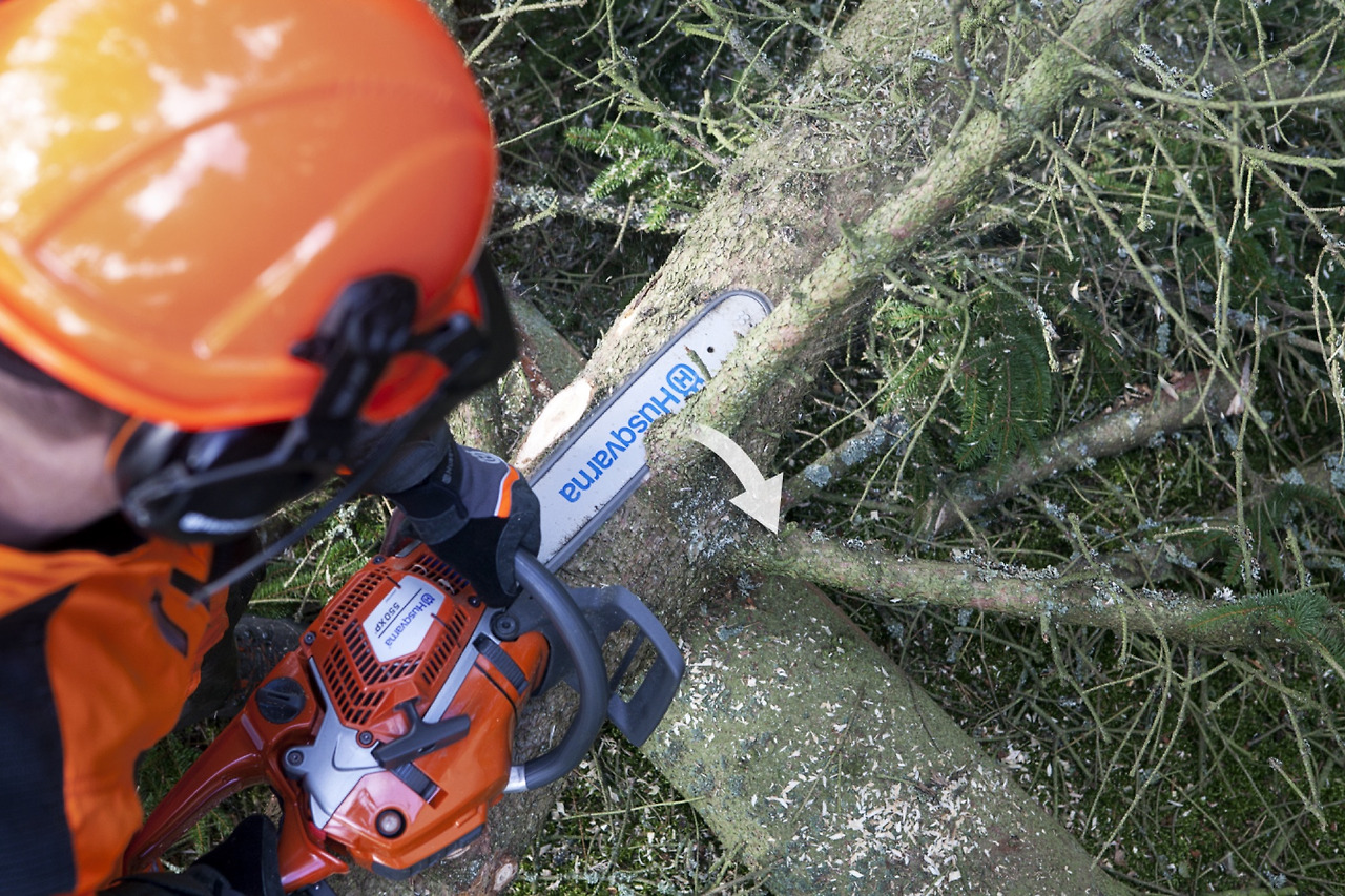 두꺼운 나뭇가지는 가이드바와 톱날이 물릴 수 있어 권장하는 방향으로 나뭇가지를 자른다.
