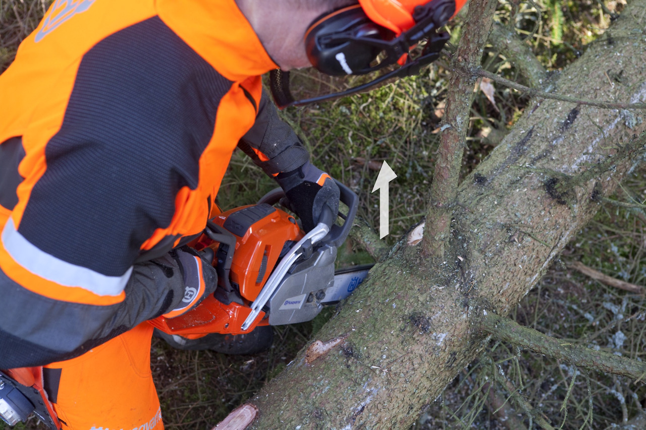 벌채목 오른쪽 나뭇가지부터 위쪽, 왼쪽 순으로 제거한다. 기계톱이 가리키는 방향과 나뭇가지 무게에 따라 가이드바 상단과 하단을 번갈아 사용한다.