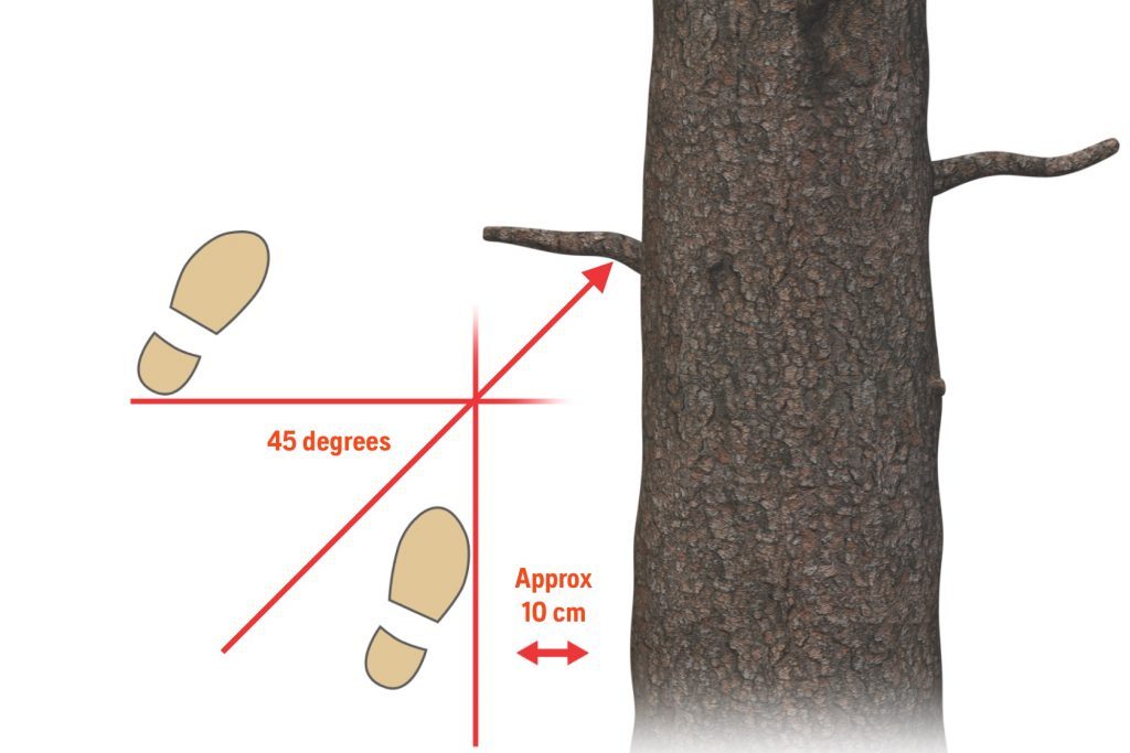 나무줄기 왼쪽 45도에 서서 벌채목으로부터 대략 10cm 떨어진 채로 준비한다. 작업순서는 뿌리부터 우듬지까지 올라간다.