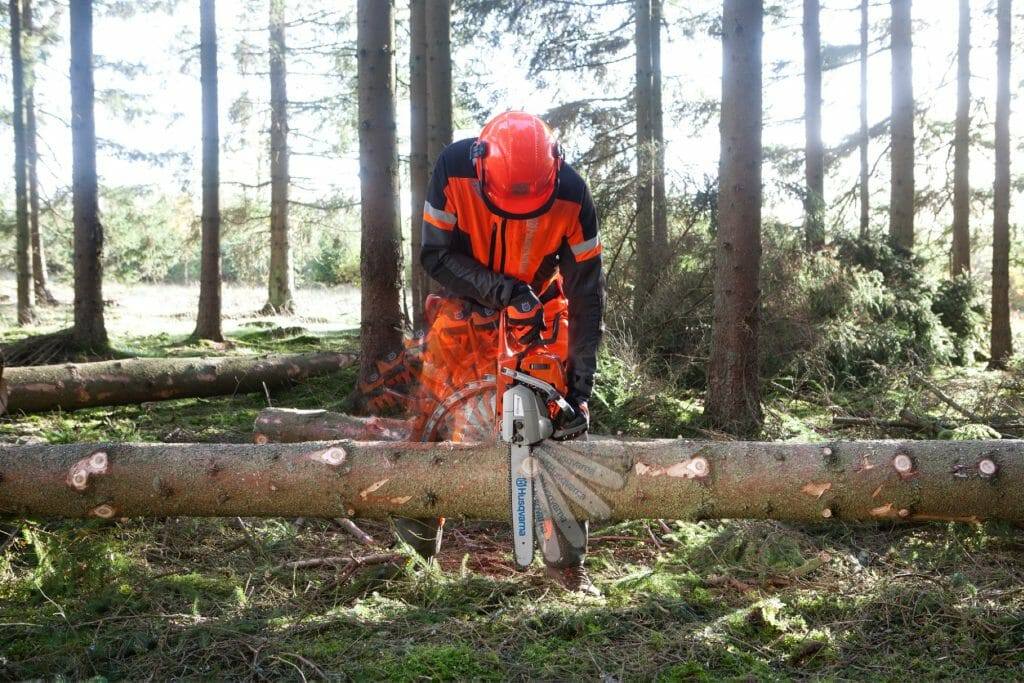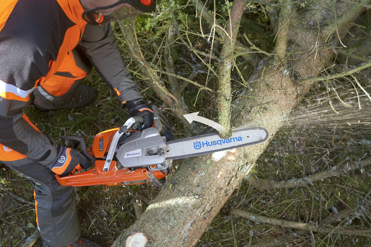 체인 브레이크를 활성화하고 왼손으로 기계톱을 잡아 나무 줄기 위에 올려두며 오른손을 이용해 가지를 제거한다.