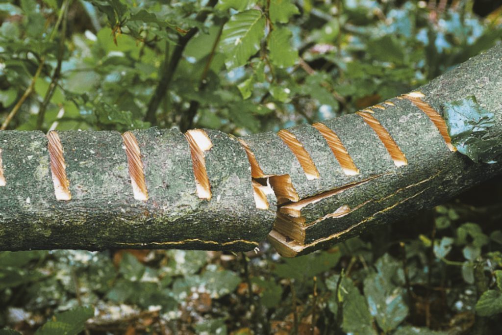 ‘활(A bow)’을 생각해 보자. 활시위를 당겼을 때 활 안쪽과 바깥 중 어느 곳이 장력을 더 많이 받을까? 나뭇가지도 똑같다. 장력을 점진적으로 줄이기 위해 활 안쪽으로 직경 1/3만큼 여러 번 톱질을 한 뒤 활 바깥쪽으로 가지가 부러질 만큼 톱질을 한다.