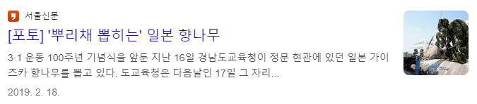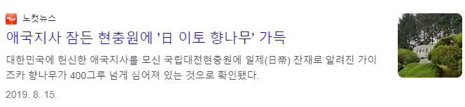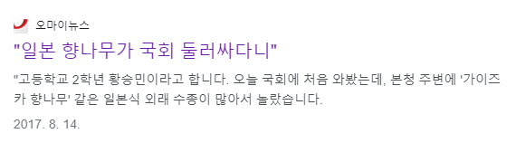관람객분들과 직접 대화를 섞어보진 않았지만 그들이 흘리는 말 한 마디씩 듣다 보면 내용이 그럴싸했다. 궁금증을 못 참고 '가이즈카향나무'에 대해 검색하면 '친일잔재 청산'과 '친일 나무'로 전국 곳곳에서 제거되었다는 뉴스가 나온다.