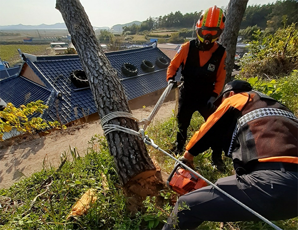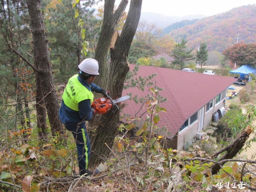 119 대원과 숲가꾸기 대원이 위험목을 제거하고 있다.