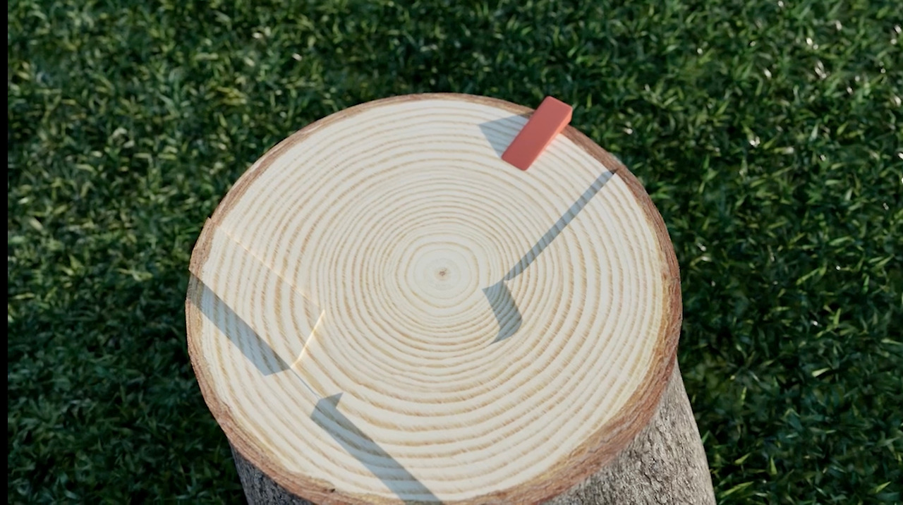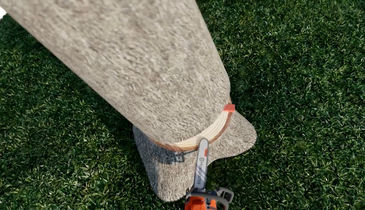 (4) 나무줄기 뒷면에 쐐기를 고정하고 반대편 파괴층을 찔러베기를 통해 만들어준다.