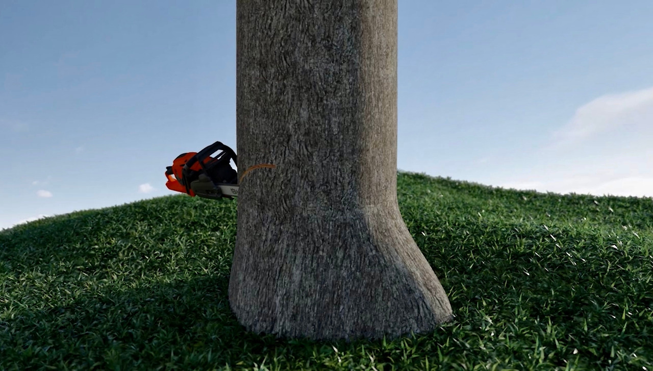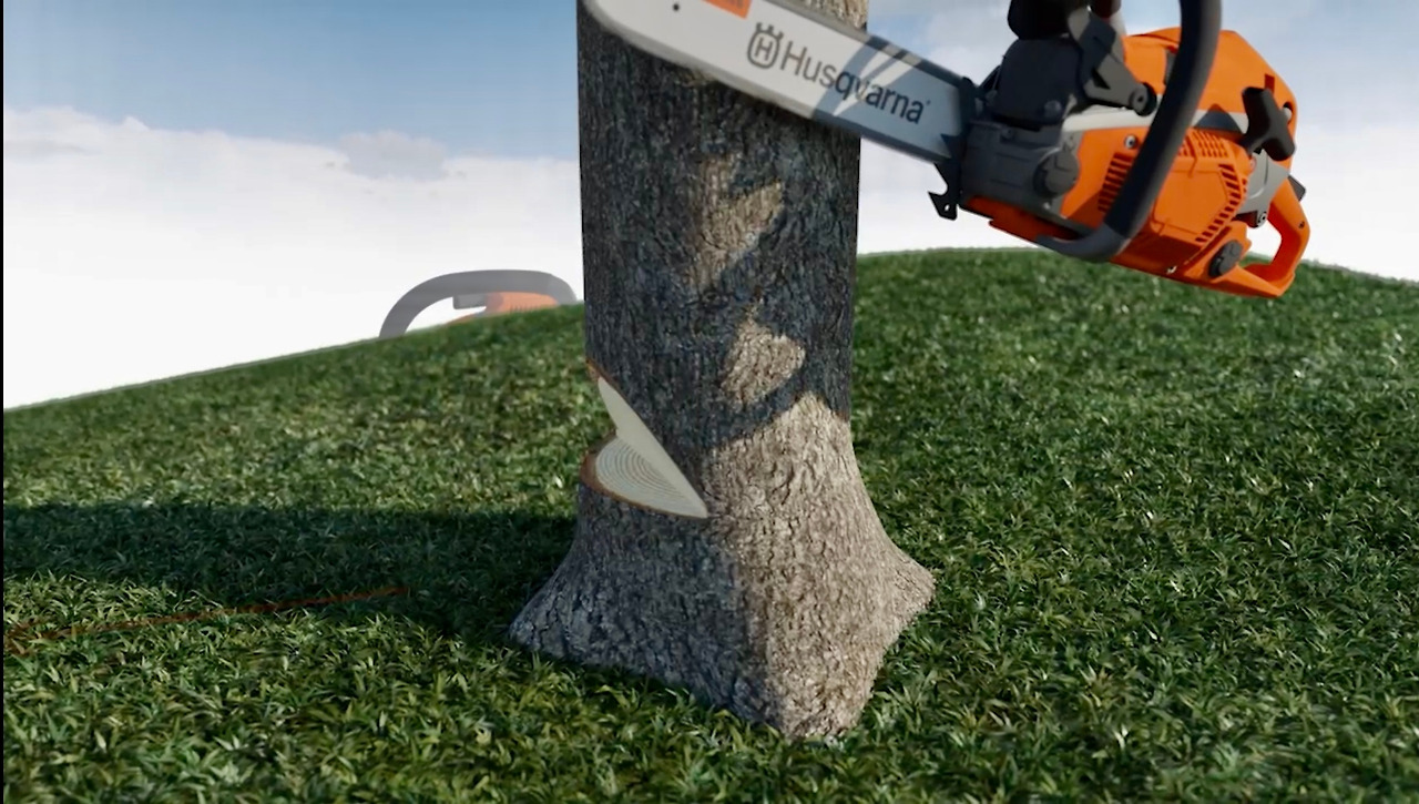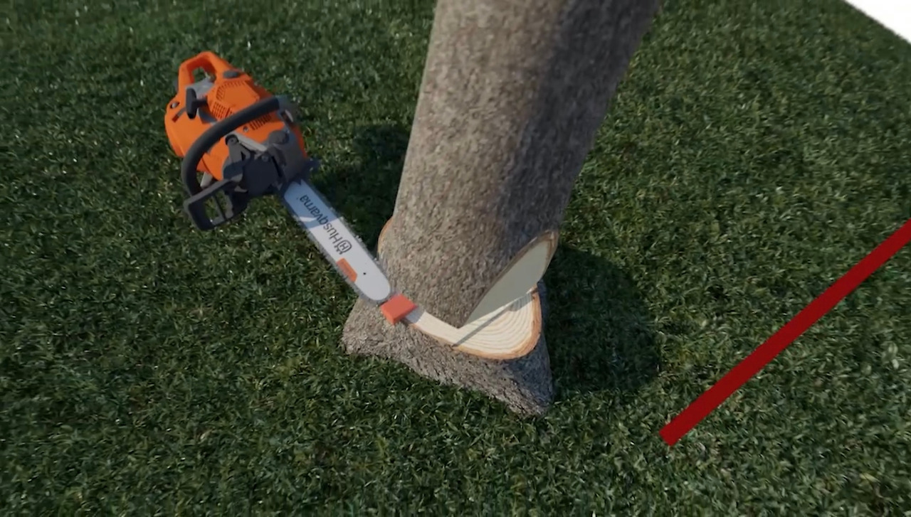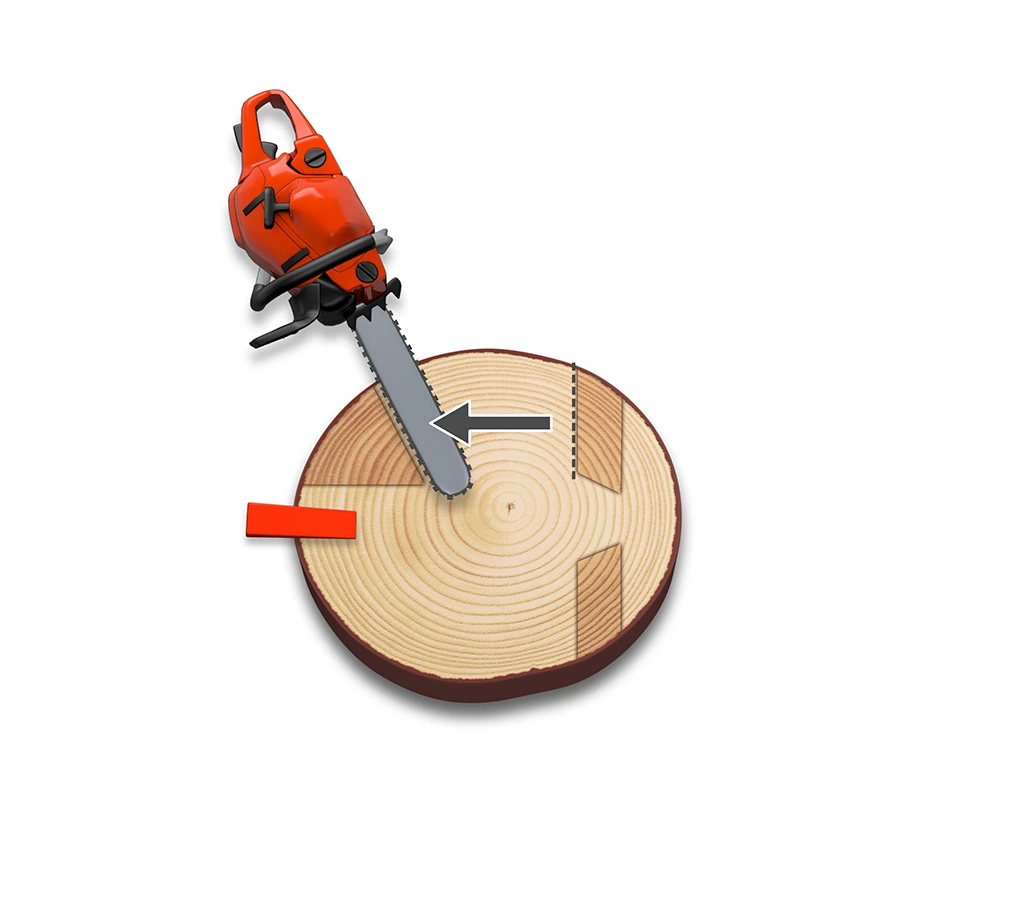 (1) 나무줄기가 기계톱보다 두꺼우므로 양방향에서 노치를 만든다.