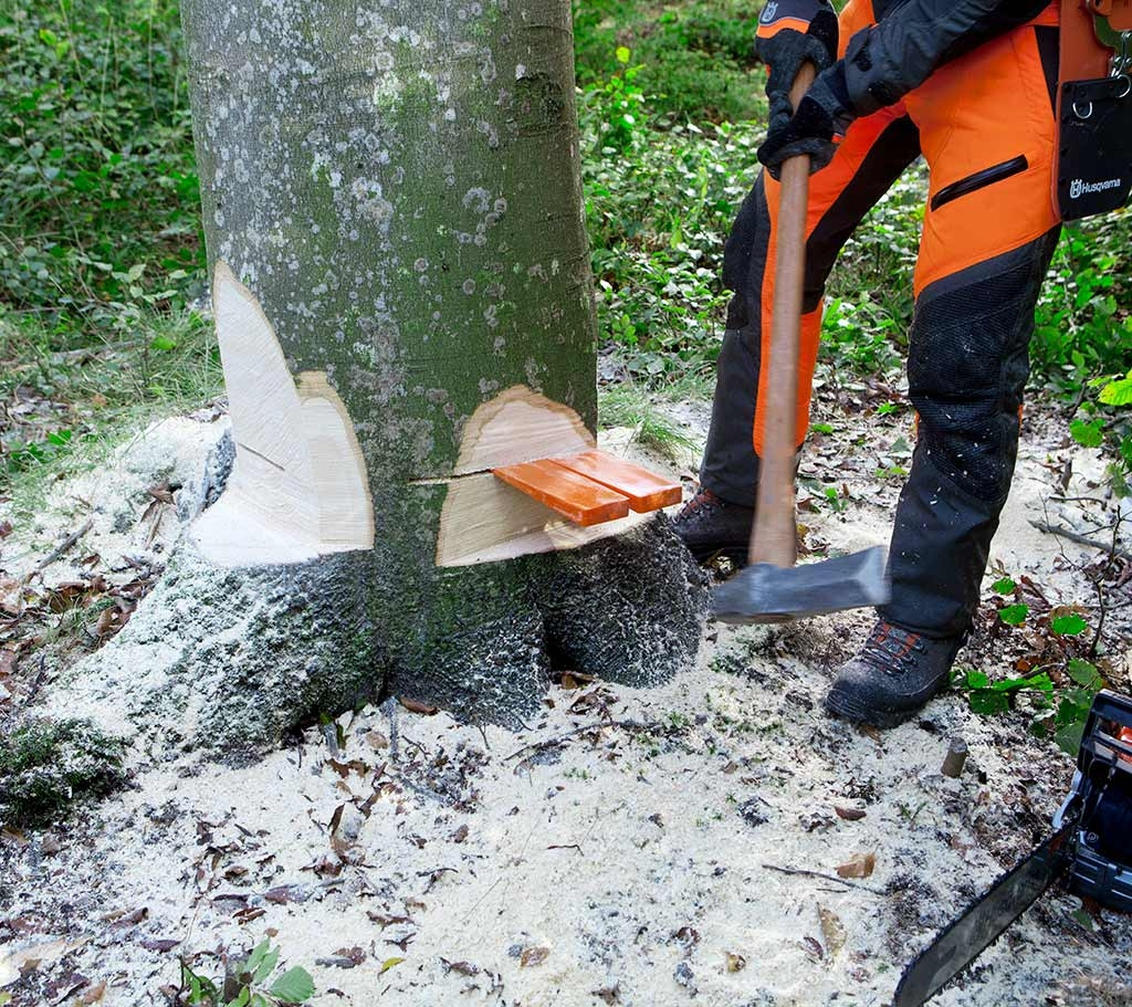 (2) 펠링 컷으로 빈 공간이 생긴 나무줄기에 쐐기나 브레이킹 바를 고정한다.