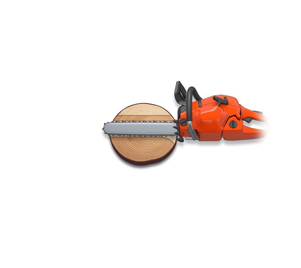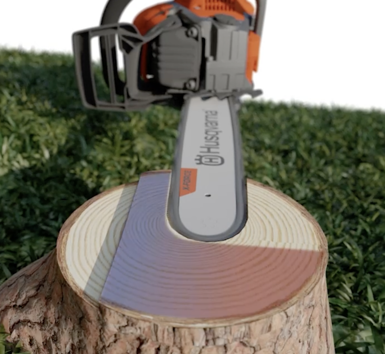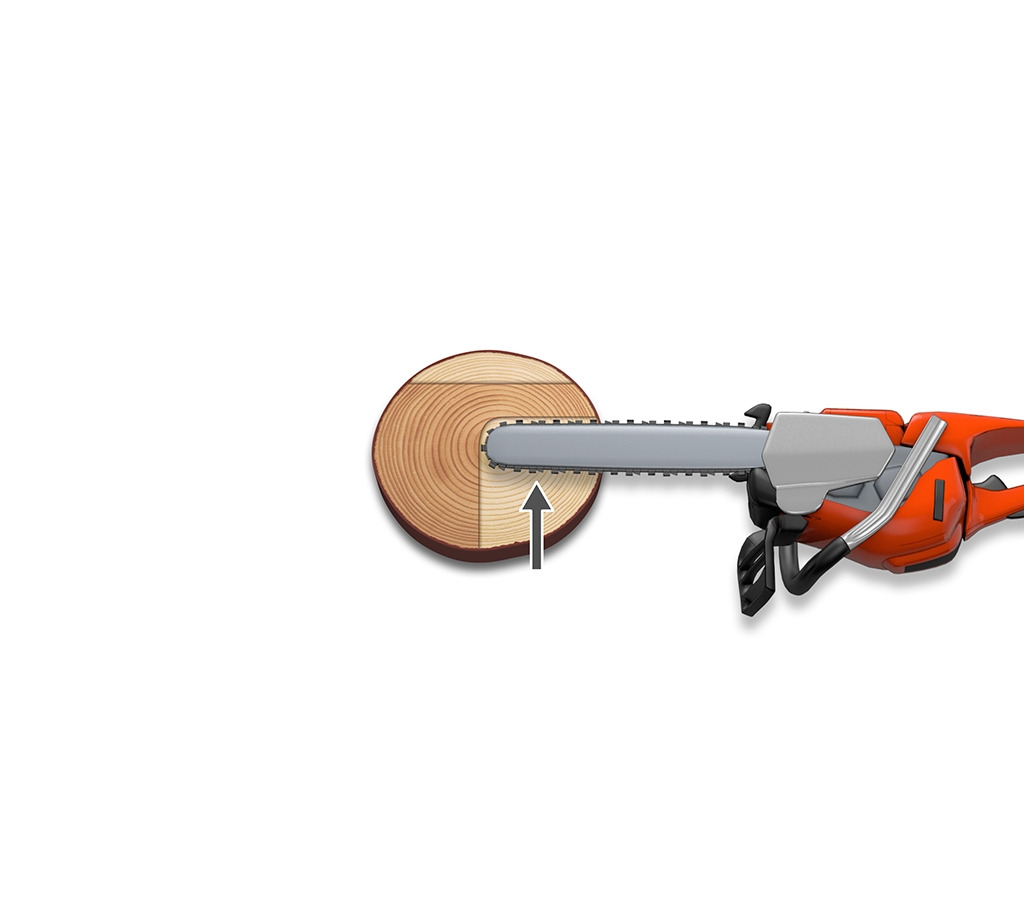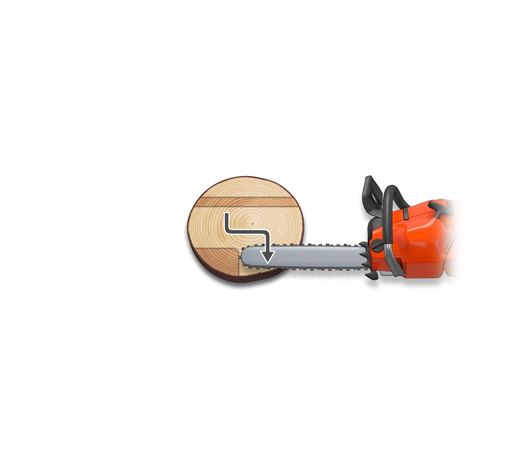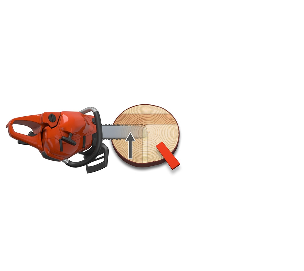 (1) 평상시와 동일하게 노치를 만들며 찔러베기를 통해 작업하는 나무 직경의 절반이나 60%가량 잘라낸 후 기계톱을 빼지 않고 그 상태로 뒤로 수평되게 자른다.