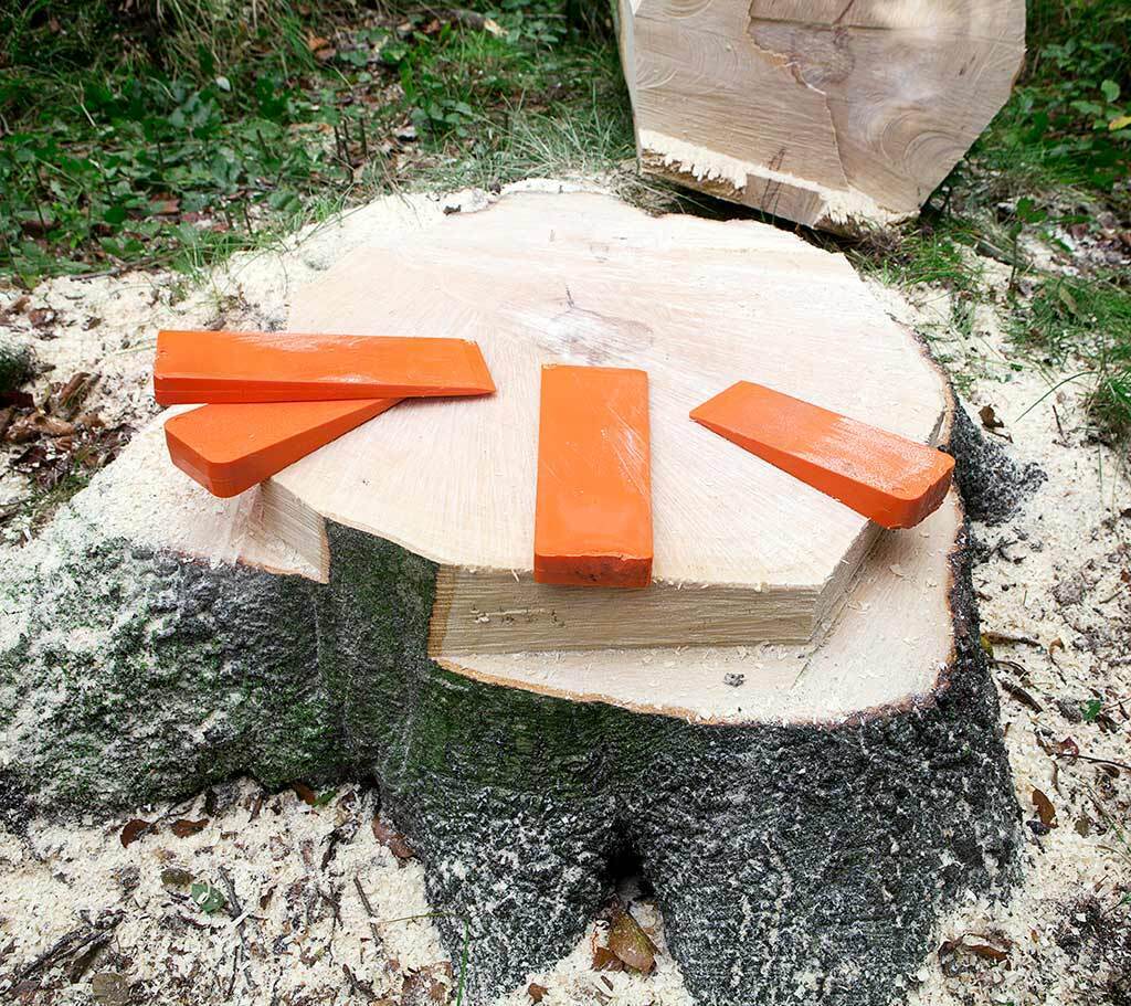 (3) 나무줄기 뒷부분 중앙에 쐐기(넓은 쐐기 사용 권장)를 사용하고 남은 모서리를 제거한다.