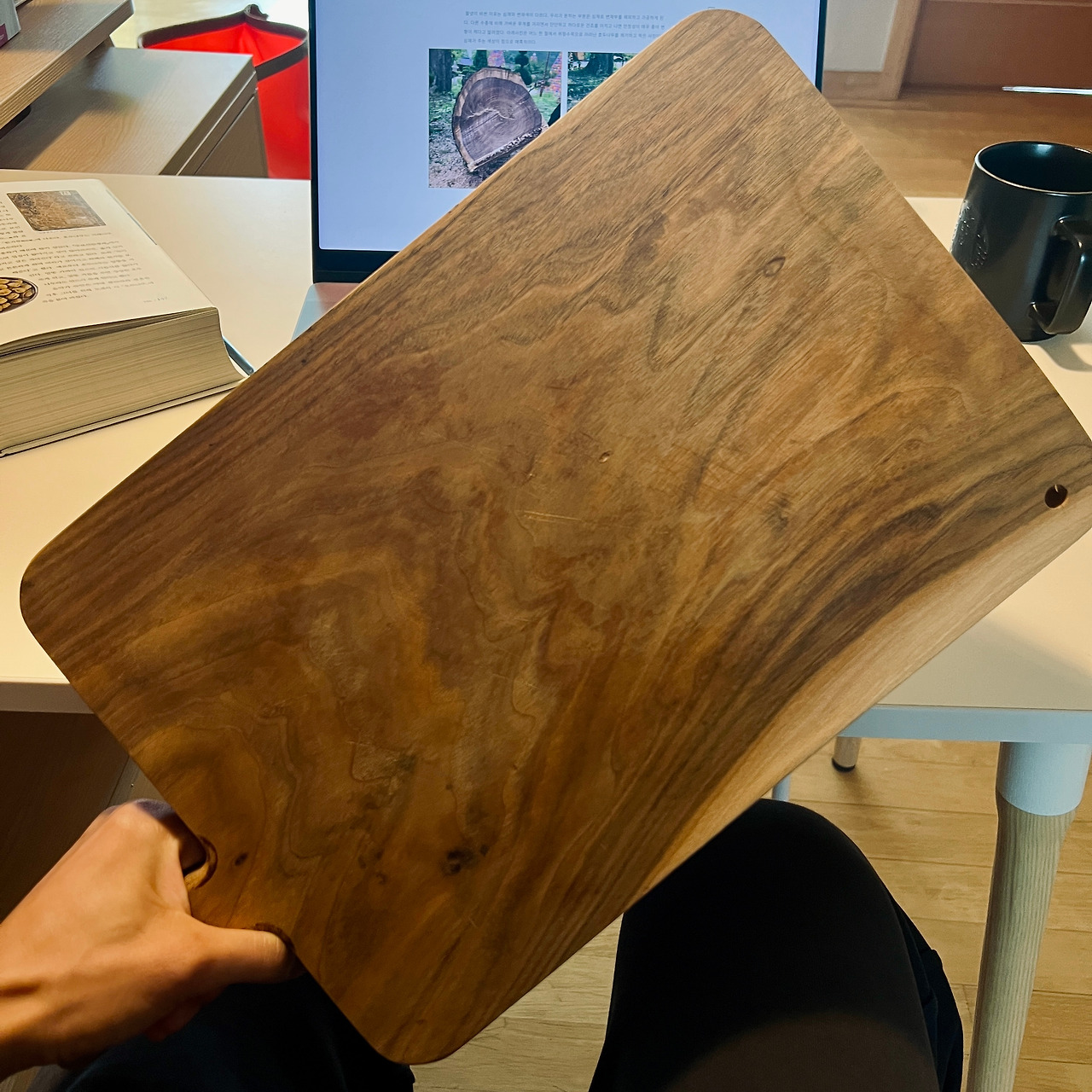 호두나무 한 토막을 잘 건조해서 만든 도마. 무늬와 색상이 매혹적이다. (너무 두껍고 크게 만들긴 했지만..;;)