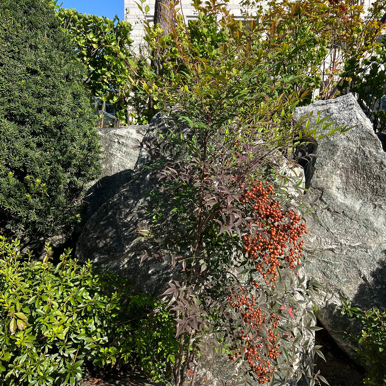 길을 걷다 보면 도로 한 모퉁이를 차지하고 있는 큰 플랜터가 보인다. 플랜터 안에는 에메랄드 그린, 블루엔젤과 같은 침엽수와 야생화 그리고 남천이 눈에 띈다. 유독 다른 계절보다 가을에 눈에 띄는 수종으로 작고 붉으며 동그란 열매가 포도송이처럼 열린 모습과 단풍 색감이 무척 아름답다. 심지어 열매는 오랫동안 나무에 남아있는다. 이런 특징으로 조경수뿐만 아니라 화분에 심거나 꽃꽂이 재료로 사용된다.