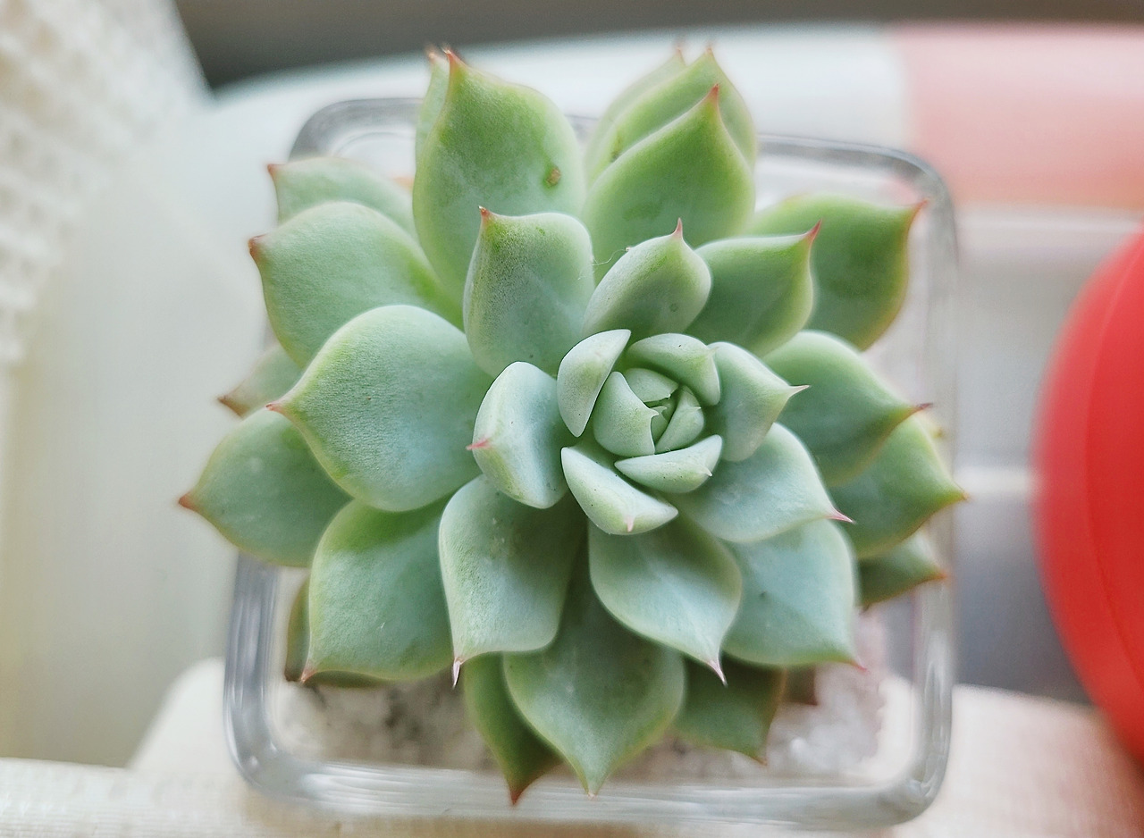 그렇게 우리 집에 오게 된 빨간 화분은 매일 정성스럽게 분무기로 물을 주고 햇볕이 드는 창가에 가져다 놓는 정성을 받고 있다. 처음에는 얼마 하다 그만둘 거라 생각하고 '이건 내 몫으로 오겠구나' 생각했는데 아직 열심히 키우는 중이다. 매일 아침 눈을 뜨면 거실 창가로 가서 화분에 물을 준다. 그 모습이 정말 생소하면서 예쁘다.