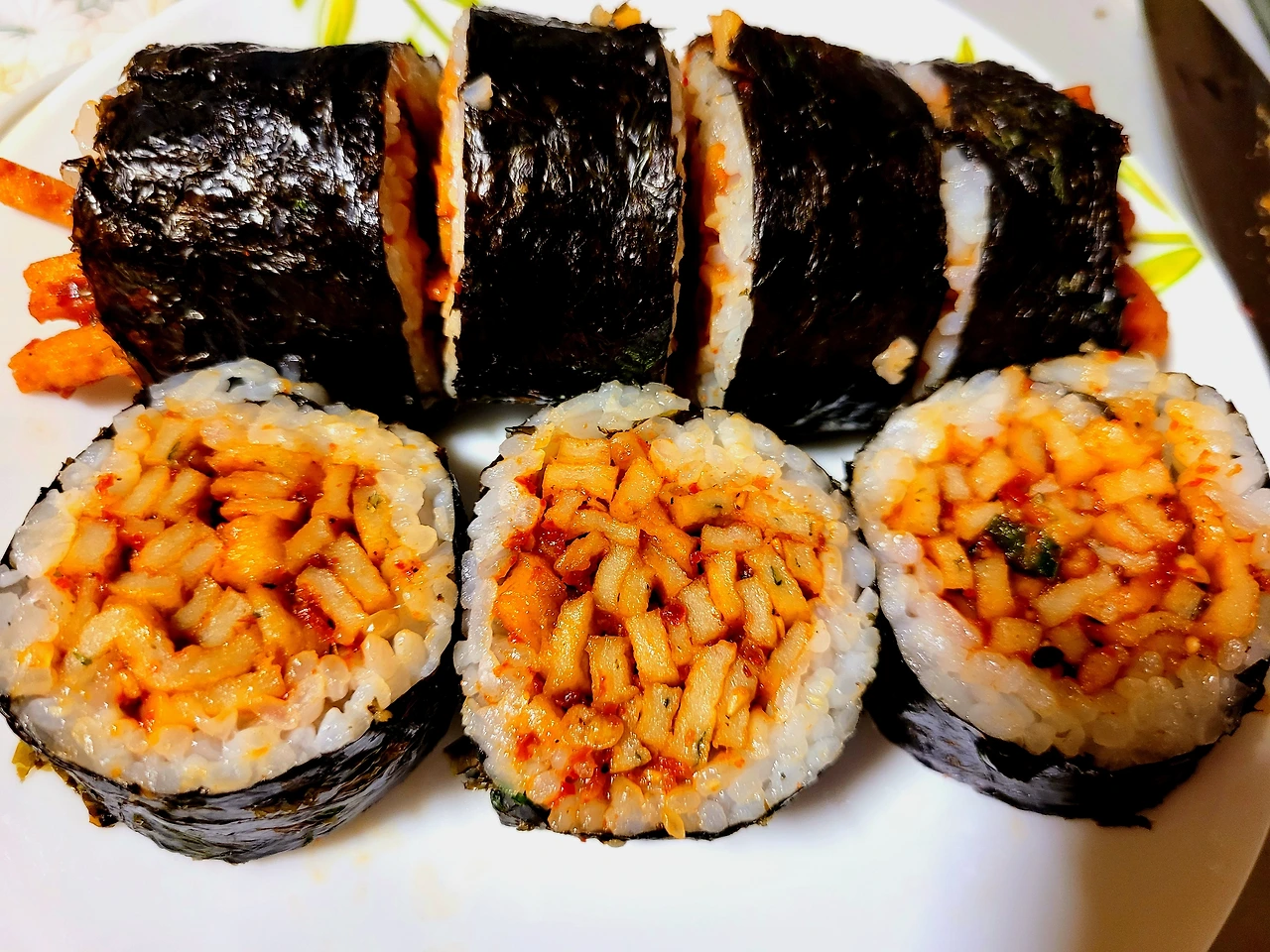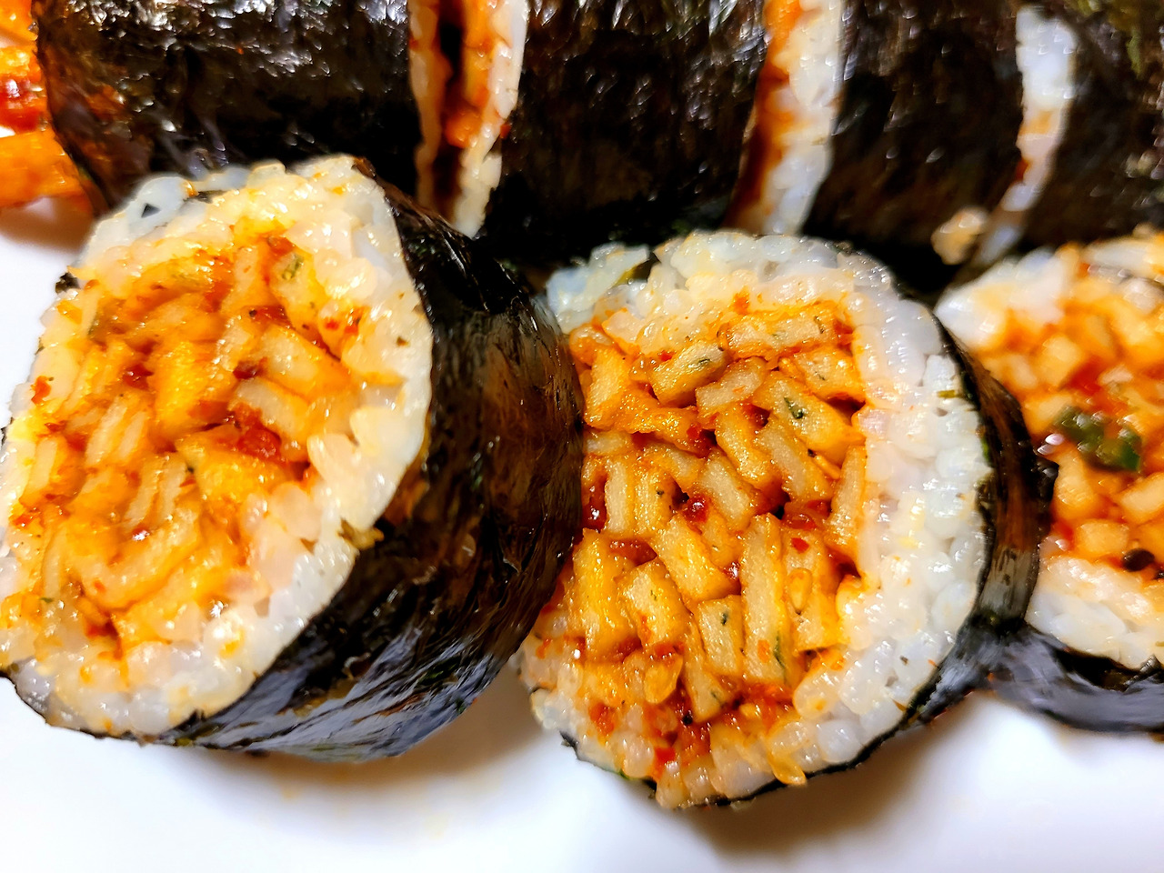 한 두 개만 먹 어도 매운맛이 끌리는 화끈한 맛이라서 속이 개운하다. 이 매운맛이 가끔 생각나고 당긴다. 김밥 몇 개 집어 먹고 나니 속이 후련하고 시원하다. 매운 것에 약한 '맵 지리'이신 분들은 덜 맵게 하는 것이 좋다.
