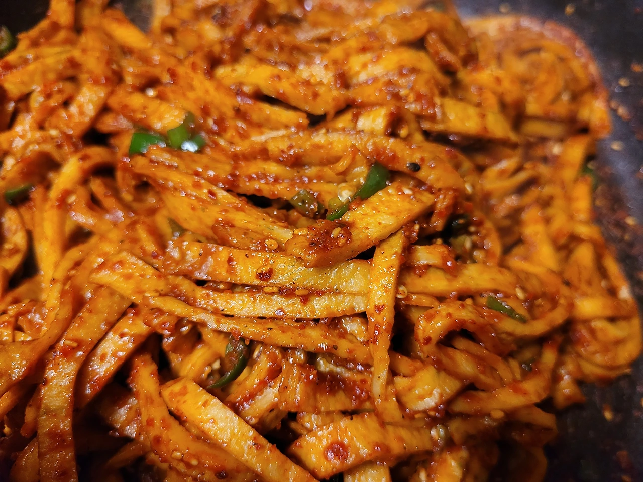 냉장고에 넣어두었던 어묵과 매운 고추, 구운 곱창김을 꺼냈다. 어묵은 가늘게 채를 썰고 고추는 잘게 썰었다. 프라이팬에 물을 조금 붓고 어묵과 매운 고추를 넣었다. 거기에 양조간장 조금, 참기름 조금, 고춧가루 많이, 후춧가루 조금, 깨소금과 올리고당까지 넣고 약한 불에서 물기가 없어질 때까지 잘 볶아주면 된다.
