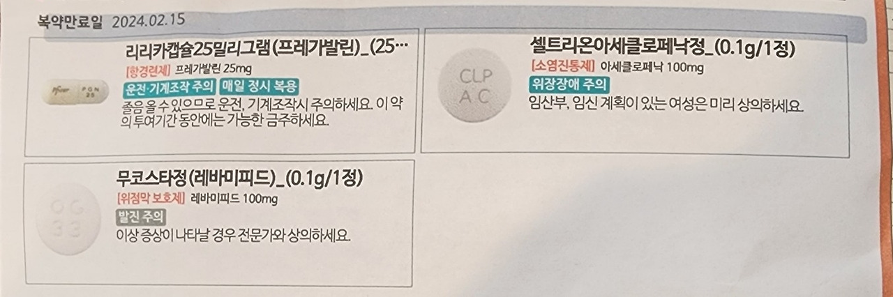 이번에는 다른 진통제를 처방 받았다. 항경련제라고 신경통 약이 포함되어 있다. 그리고 진통제, 위점막보호제 등이다. 항바이러스제는 먹지 말라고 한다.