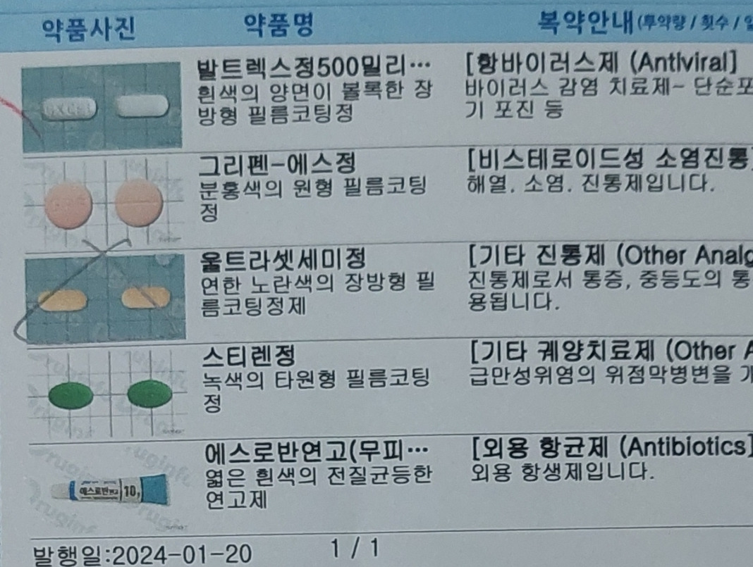 항바이러스 약, 진통제2종, 위점막보호제, 연고 등을 처방받았다. 1주일치.