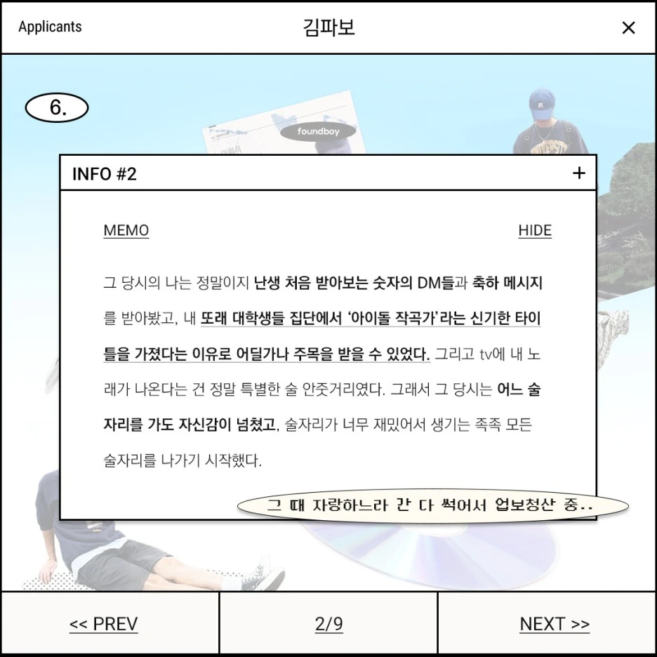 그 당시의 나는 정말이지 난생 처음 받아보는 숫자의 DM들과 축하 메시지를 받아봤고, 내 또래 대학생들 집단에서 ‘아이돌 작곡가’라는 신기한 타이틀을 가졌다는 이유로 어딜가나 주목을 받을 수 있었다. 그리고 tv에 내 노래가 나온다는 건 정말 특별한 술 안줏거리였다. 그래서 그 당시는 어느 술자리를 가도 자신감이 넘쳤고, 술자리가 너무 재밌어서 생기는 족족 모든 술자리를 나가기 시작했다.
