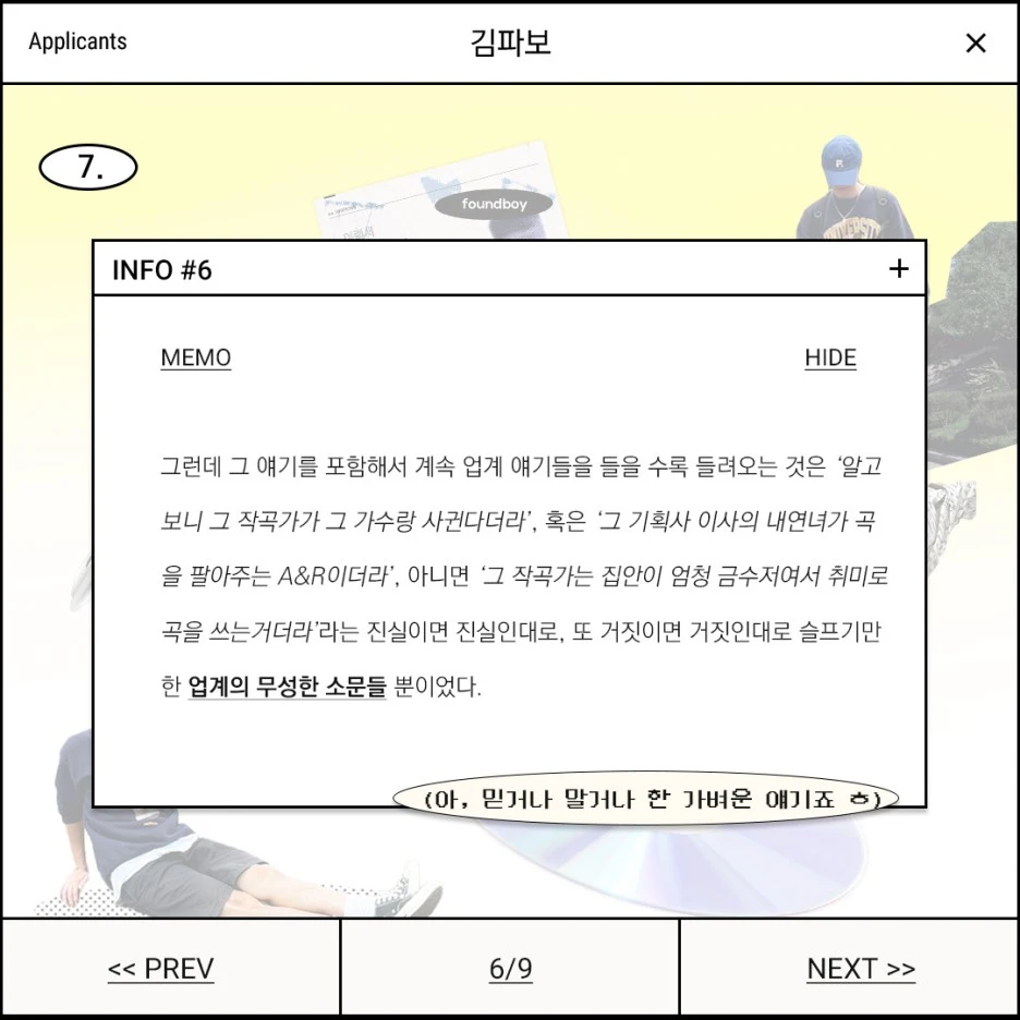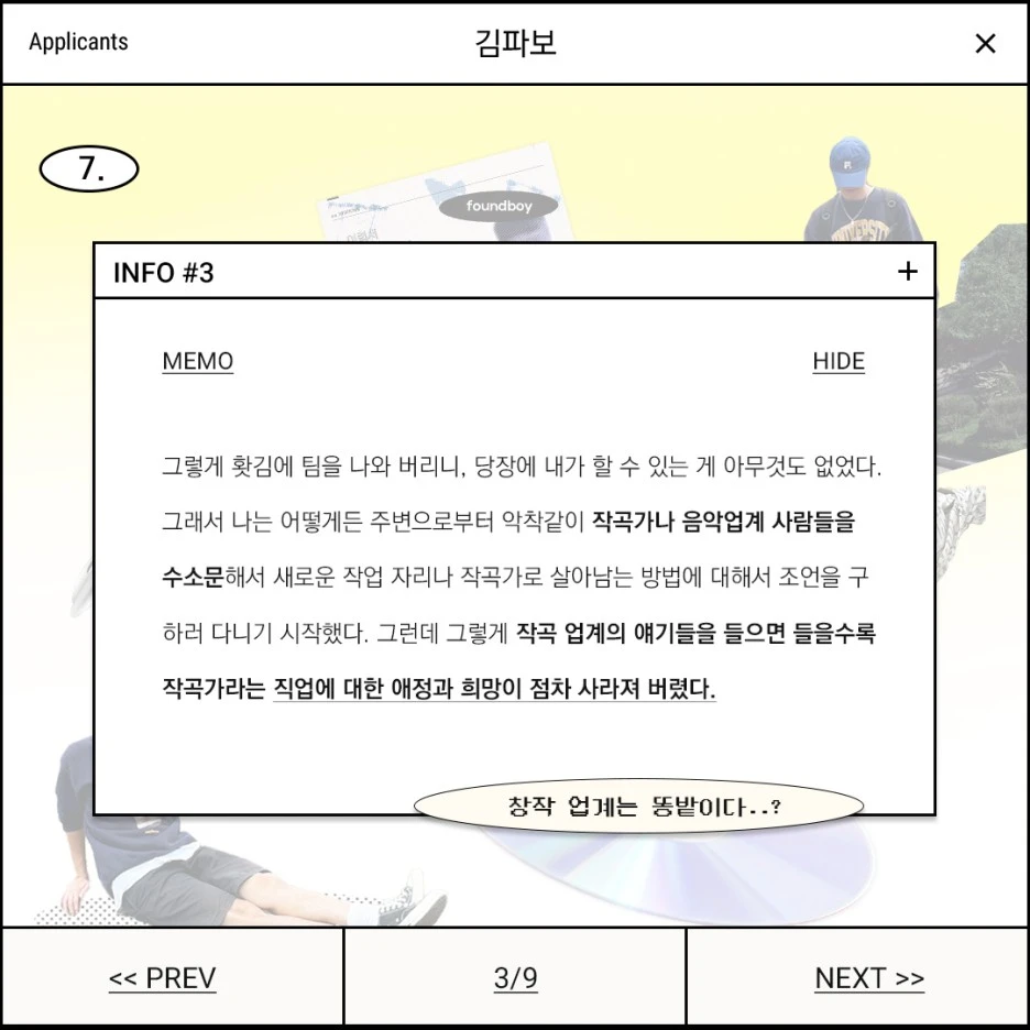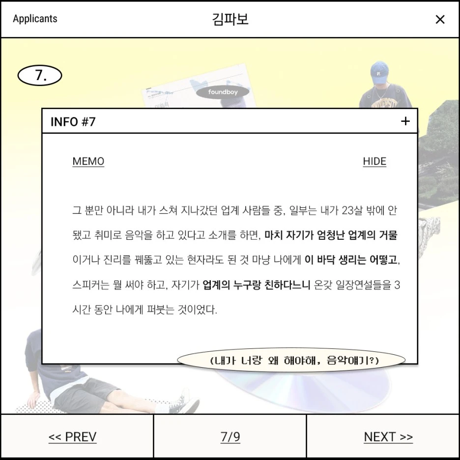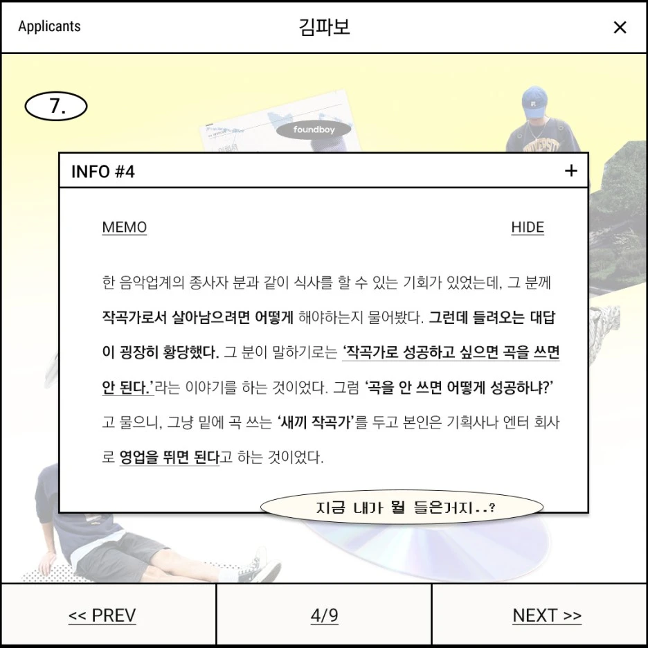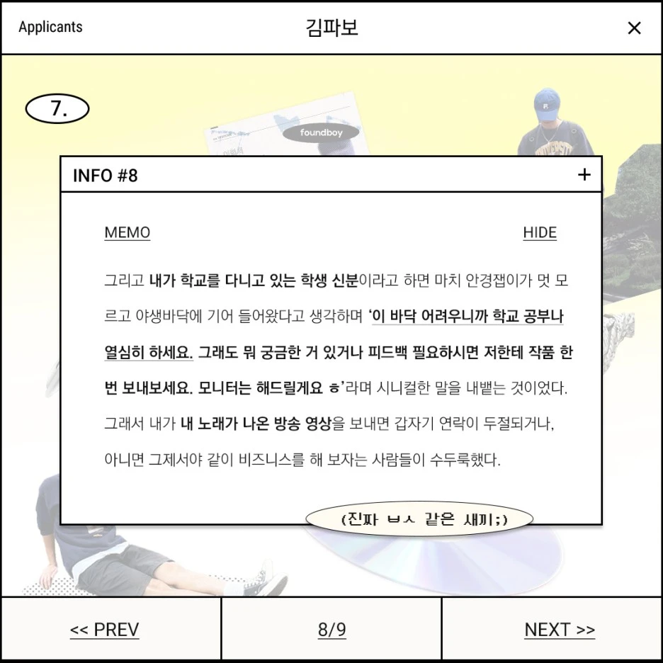 그리고 내가 학교를 다니고 있는 학생 신분이라고 하면 마치 안경잽이가 멋 모르고 야생바닥에 기어 들어왔다고 생각하며 ‘이 바닥 어려우니까 학교 공부나 열심히 하세요. 그래도 뭐 궁금한 거 있거나 피드백 필요하시면 저한테 작품 한 번 보내보세요. 모니터는 해드릴게요 ㅎ’라며 시니컬한 말을 내뱉는 것이었다. 그래서 내가 내 노래가 나온 방송 영상을 보내면 갑자기 연락이 두절되거나, 아니면 그제서야 같이 비즈니스를 해 보자는 사람들이 수두룩했다.