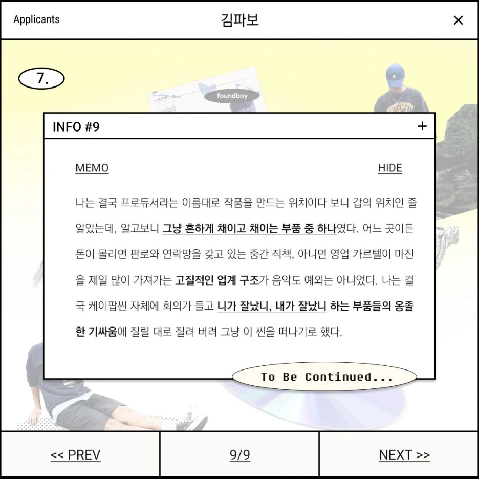 나는 결국 프로듀서라는 이름대로 작품을 만드는 위치이다 보니 갑의 위치인 줄 알았는데, 알고보니 그냥 흔하게 채이고 채이는 부품 중 하나였다. 어느 곳이든 돈이 몰리면 판로와 연락망을 갖고 있는 중간 직책, 아니면 영업 카르텔이 마진을 제일 많이 가져가는 고질적인 업계 구조가 음악도 예외는 아니었다. 나는 결 국 케이팝씬 자체에 회의가 들고 니가 잘났니, 내가 잘났니하는 부품들의 옹졸한 기싸움에 질릴 대로 질려 버려 그냥 이 씬을 떠나기로 했다.