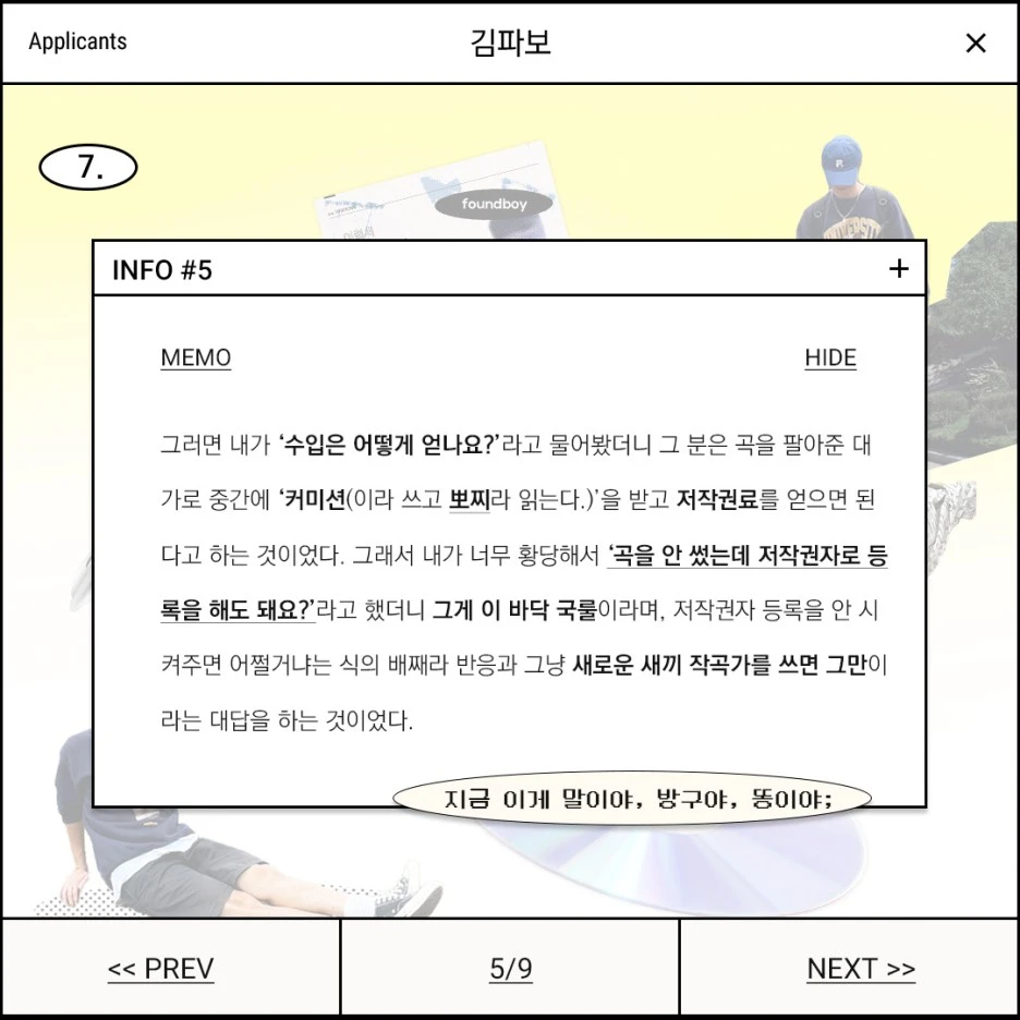 그러면 내가 ‘수입은 어떻게 얻나요?’라고 물어봤더니 그 분은 곡을 팔아준 대가로 중간에 ‘커미션(이라 쓰고 뽀찌라 읽는다.)’을 받고 저작권료를 얻으면 된 다고 하는 것이었다. 그래서 내가 너무 황당해서 ‘곡을 안 썼는데 저작권자로 등록을 해도 돼요?’라고 했더니 그게 이 바닥 국룰이라며, 저작권자 등록을 안 시켜주면 어쩔거냐는 식의 배째라 반응과 그냥 새로운 새끼 작곡가를 쓰면 그만이라는 대답을 하는 것이었다.