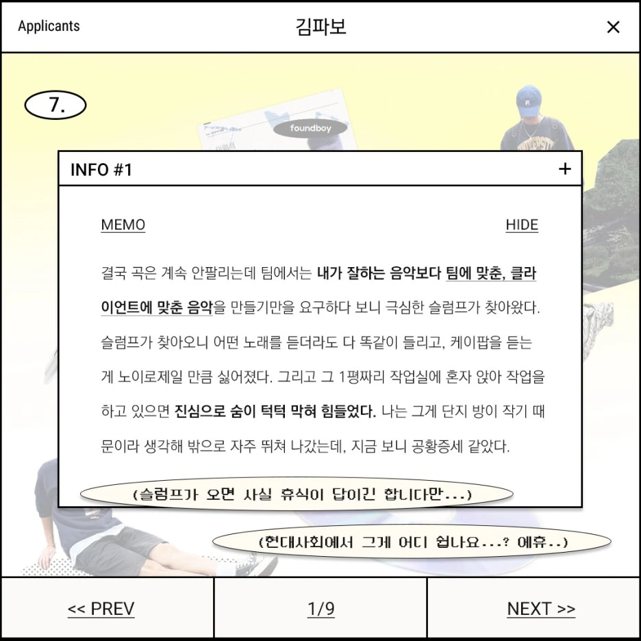 결국 곡은 계속 안팔리는데 팀에서는 내가 잘하는 음악보다 팀에 맞춘, 클라이언트에 맞춘 음악을 만들기만을 요구하다 보니 극심한 슬럼프가 찾아왔다. 슬럼프가 찾아오니 어떤 노래를 듣더라도 다 똑같이 들리고, 케이팝을 듣는 게 노이로제일 만큼 싫어졌다. 그리고 그 1평짜리 작업실에 혼자 앉아 작업을 하고 있으면 진심으로 숨이 턱턱 막혀 힘들었다. 나는 그게 단지 방이 작기 때문이라 생각해 밖으로 자주 뛰쳐 나갔는데, 지금 보니 공황증세 같았다.