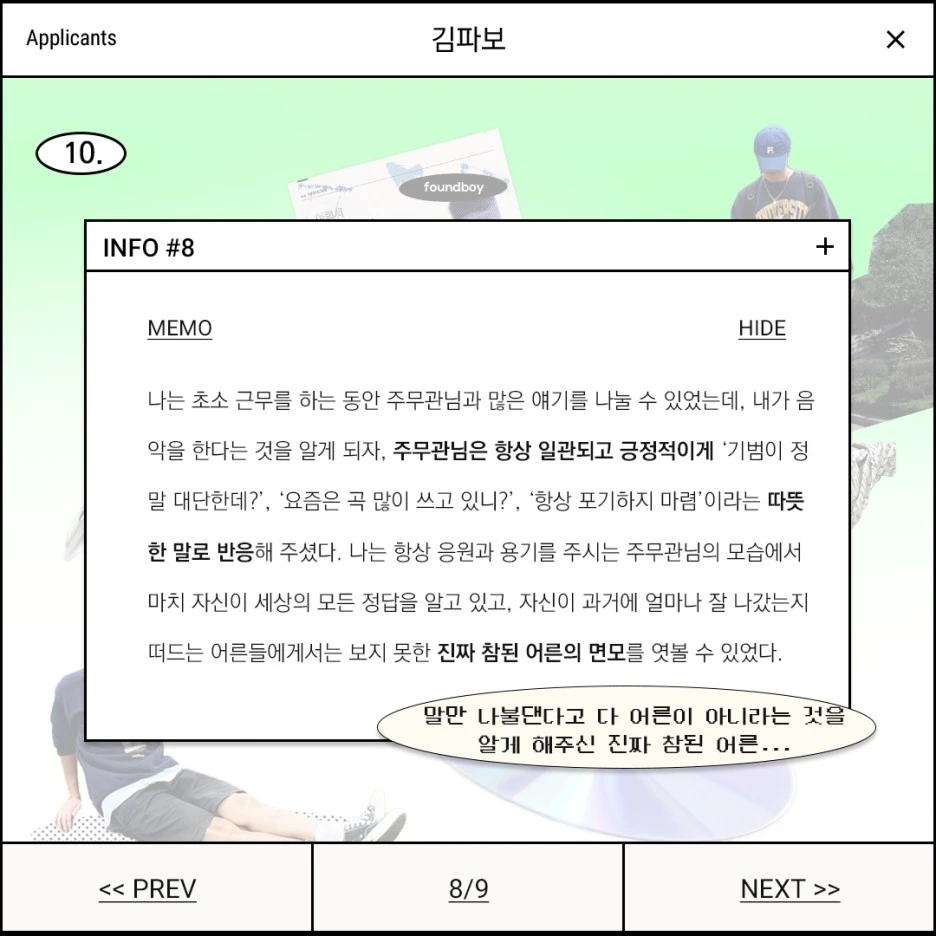 나는 초소 근무를 하는 동안 주무관님과 많은 얘기를 나눌 수 있었는데, 내가 음악을 한다는 것을 알게 되자, 주무관님은 항상 일관되고 긍정적이게 ‘기범이 정말 대단한데?’, ‘요즘은 곡 많이 쓰고 있니?’, ‘항상 포기하지 마렴’이라는 따뜻한 말로 반응해 주셨다. 나는 항상 응원과 용기를 주시는 주무관님의 모습에서 마치 자신이 세상의 모든 정답을 알고 있고, 자신이 과거에 얼마나 잘 나갔는지 떠드는 어른들에게서는 보지 못한 진짜 참된 어른의 면모를 엿볼 수 있었다.
