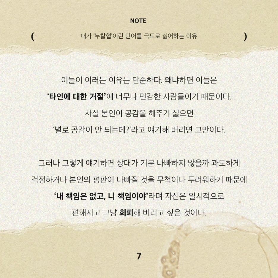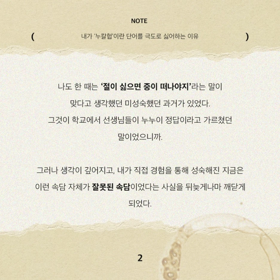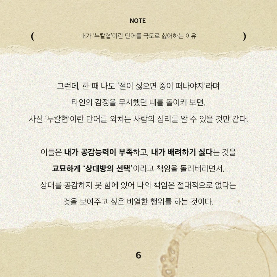 그런데, 한 때 나도 ‘절이 싫으면 중이 떠나야지’라며 타인의 감정을 무시했던 때를 돌이켜 보면, 사실 ‘누칼협’이란 단어를 외치는 사람의 심리를 알 수 있을 것만 같다.