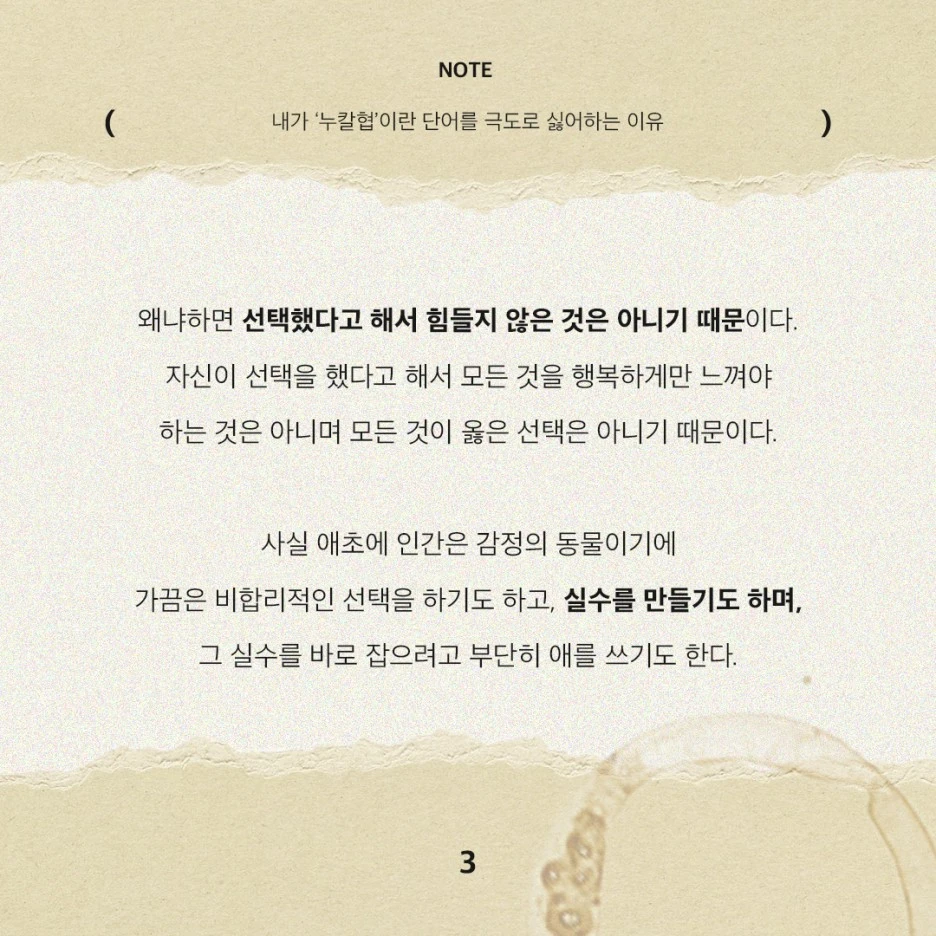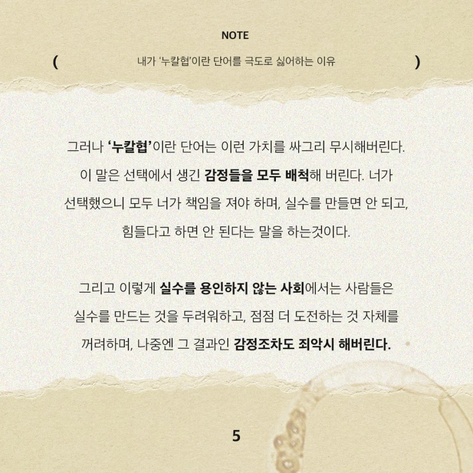 그러나 ‘누칼협’이란 단어는 이런 가치를 싸그리 무시해버린다. 이 말은 선택에서 생긴 감정들을 모두 배척해 버린다. 너가 선택했으니 모두 너가 책임을 져야 하며, 실수를 만들면 안 되고, 힘들다고 하면 안 된다는 말을 하는것이다.