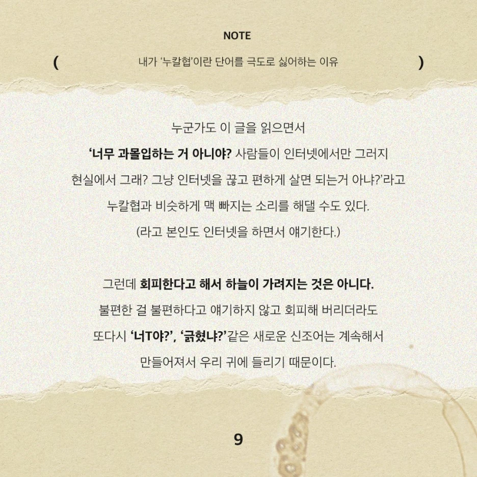 누군가도 이 글을 읽으면서 ‘너무 과몰입하는 거 아니야? 사람들이 인터넷에서만 그러지 현실에서 그래? 그냥 인터넷을 끊고 편하게 살면 되는거 아냐?’라고 누칼협과 비슷하게 맥 빠지는 소리를 해댈 수도 있다. (라고 본인도 인터넷을 하면서 얘기한다.)