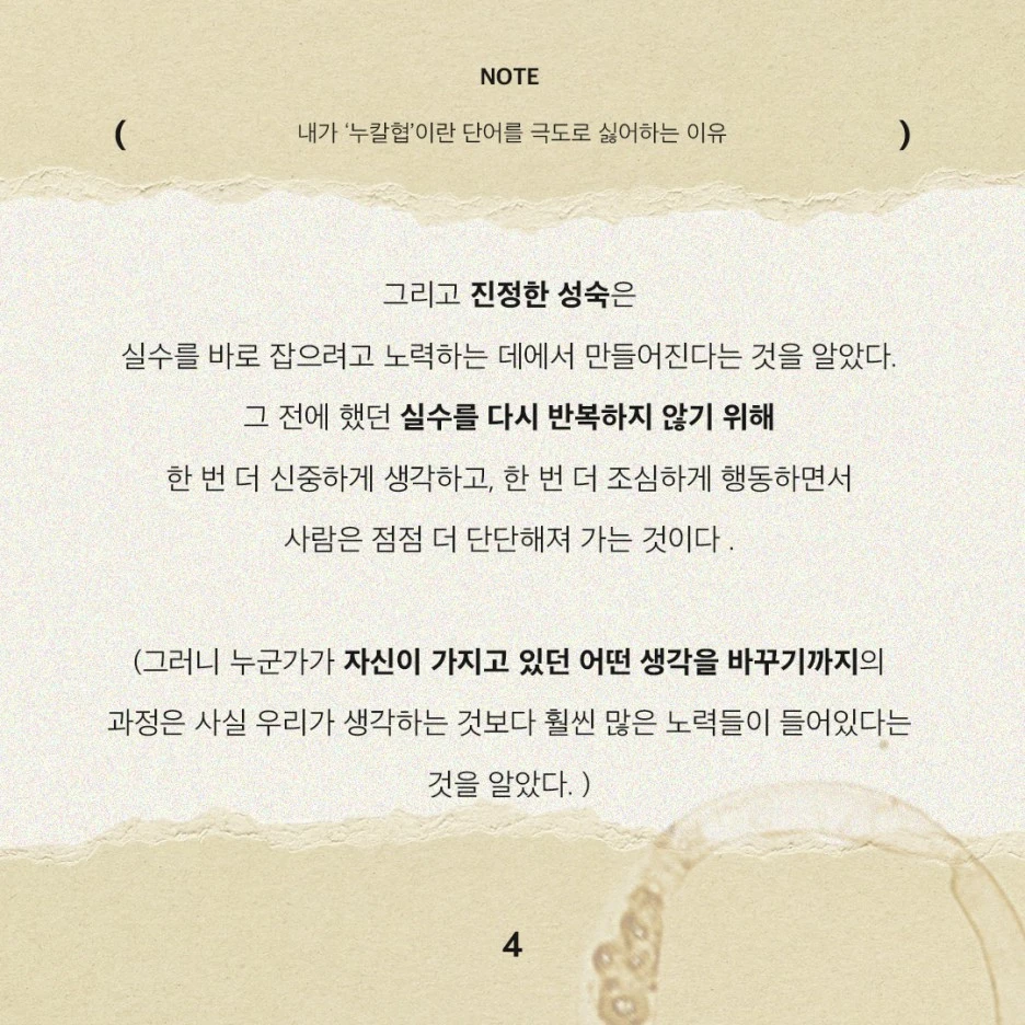 그리고 진정한 성숙은 실수를 바로 잡으려고 노력하는 데에서 만들어진다는 것을 알았다. 그 전에 했던 실수를 다시 반복하지 않기 위해 한 번 더 신중하게 생각하고, 한 번 더 조심하게 행동하면서 사람은 점점 더 단단해져 가는 것이다.