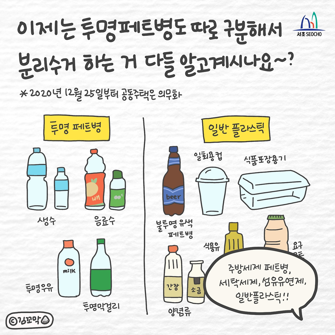 코로나로 배달과 택배소비가 들어 일회용품 배출량도 증가하고 있는데요. 이제는 투명 페트병도 따로 구분해서 분리배출하는 거 다들 알고 계시나요? (2020년 12월 25일부터 공동주택은 의무화) 보통은 내용물을 비우고 물로 헹궈서 라벨을 뗀 뒤 밟아서 부피를 줄이고 뚜껑을 닫고 플라스틱으로 분류하여 한꺼번에 버리면 됐지만, 이제는 투명 페트병과 일반 플라스틱을 구분해서 버려야 한답니다!