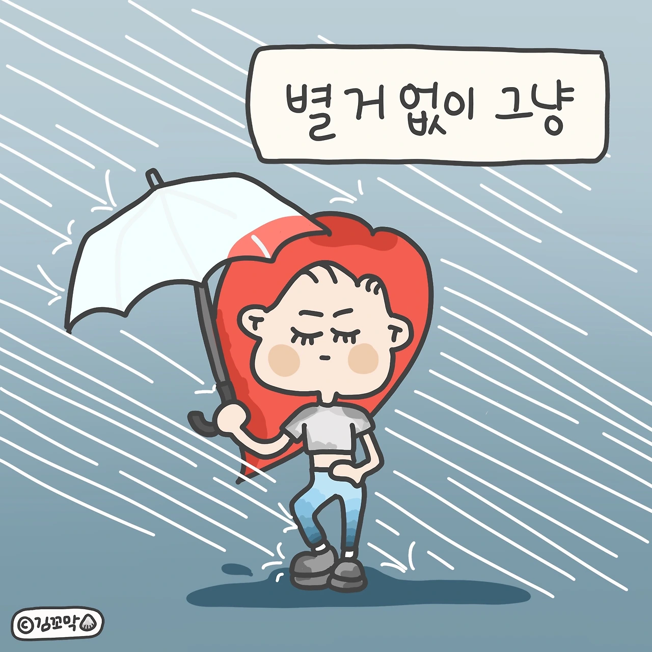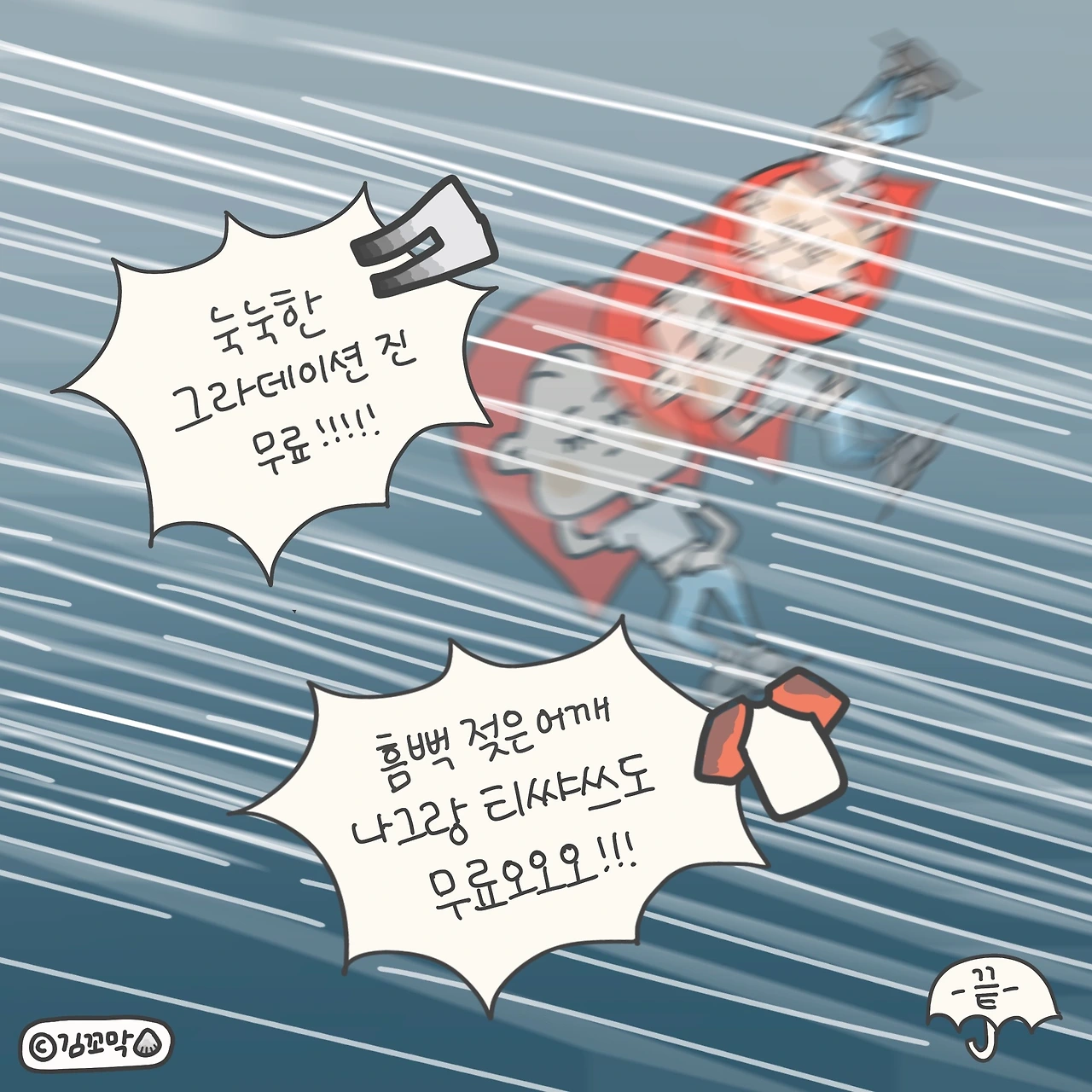 긴바지 입고 가면 바지 아랫단부터 서서히 물들어 요즘 최신 유행하는 그라데이션 진이 되고, 그냥 티셔츠를 입으면 어깻죽지가 흠뻑 젖어 10여 년 전 유행했던 나그랑 티셔츠가 된다. 장마철 패션 고민할 필요 없이 그냥 젖는 대로 놔두면 이 구역 패셔니 스타가 될 수 있다는 것이다.