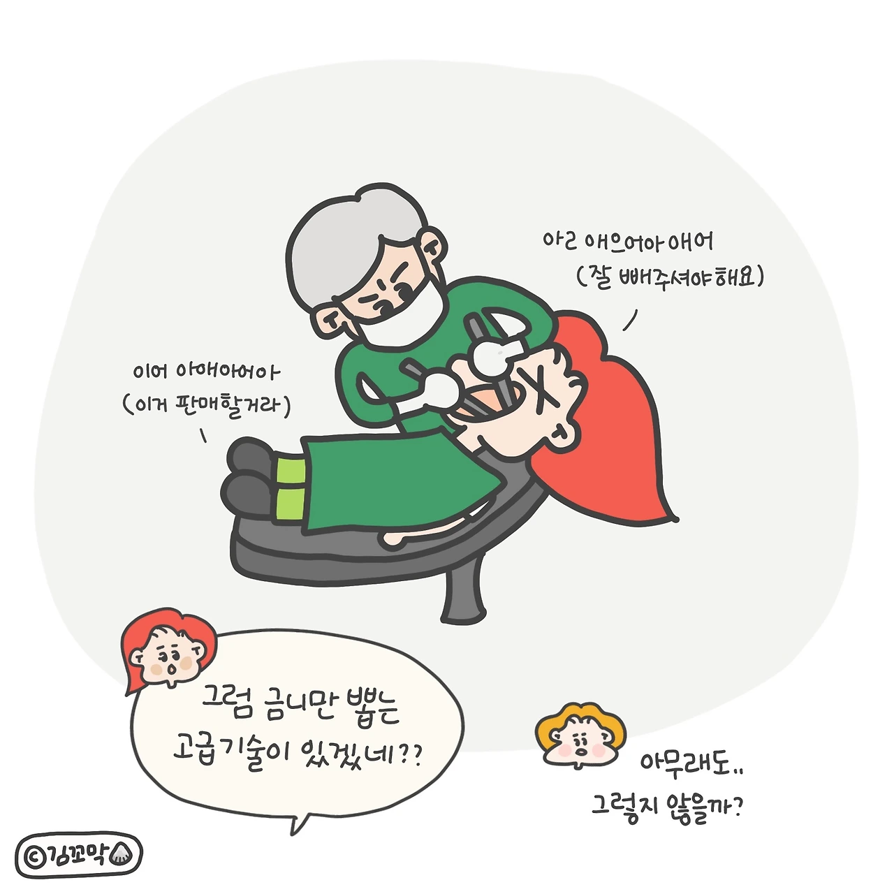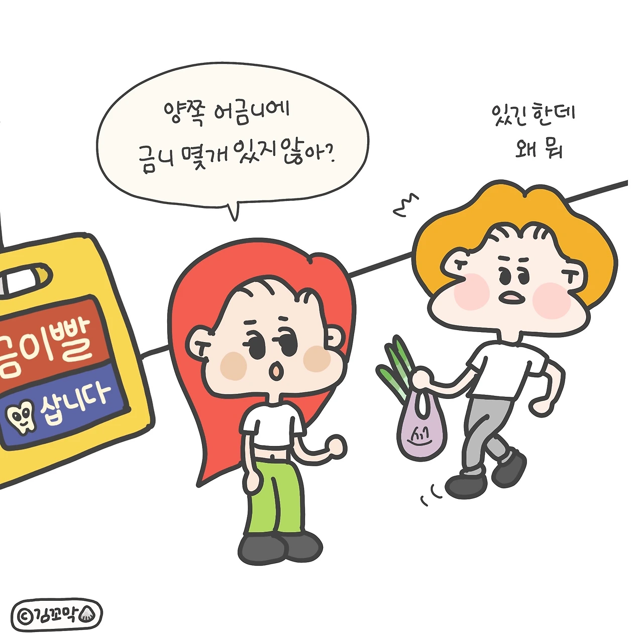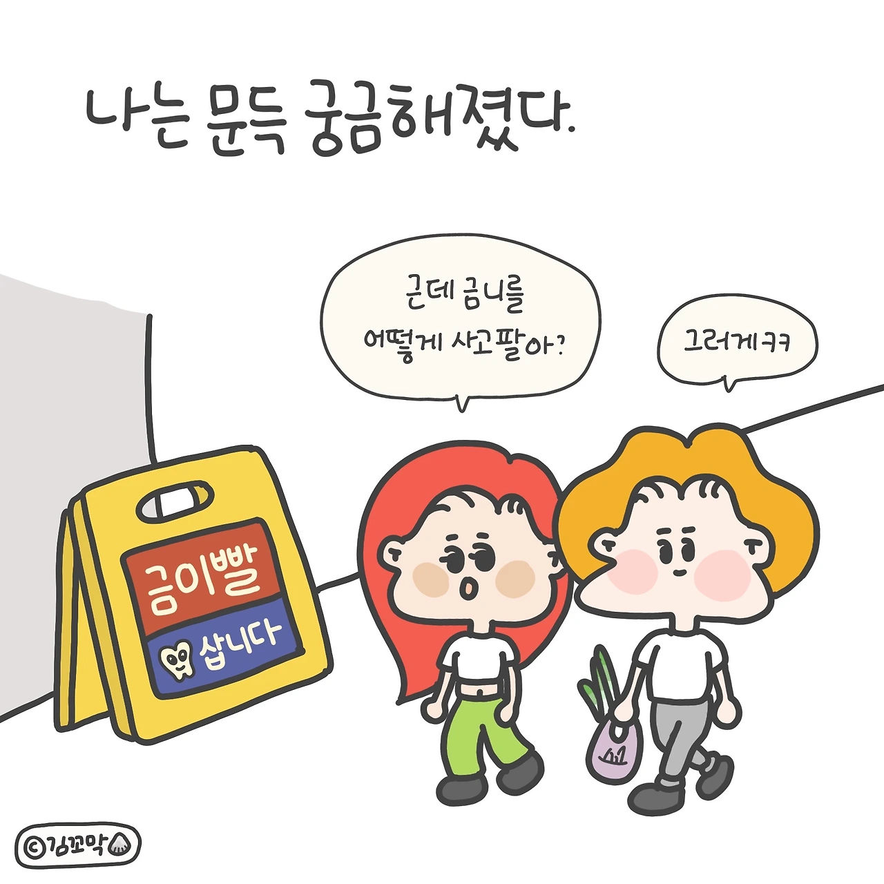 양 어금니에 금을 장착하고 있는 남편과 이야기를 주고받다가 너무 궁금한 나머지 인스타툰 소재로 잡고 그려 업로드했는데, 아니나 다를까 집단지성을 모아준 팔로워분들 덕분에 궁금증이 완벽하게 해소되었다. 앞으로 궁금한 거 있으면 그림으로 그려 올려봐야겠다 할 정도. (댓글 달아주는 분들 너무 귀여움 ㅠㅠ..)
