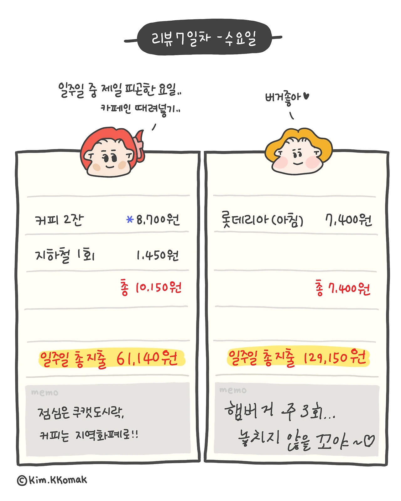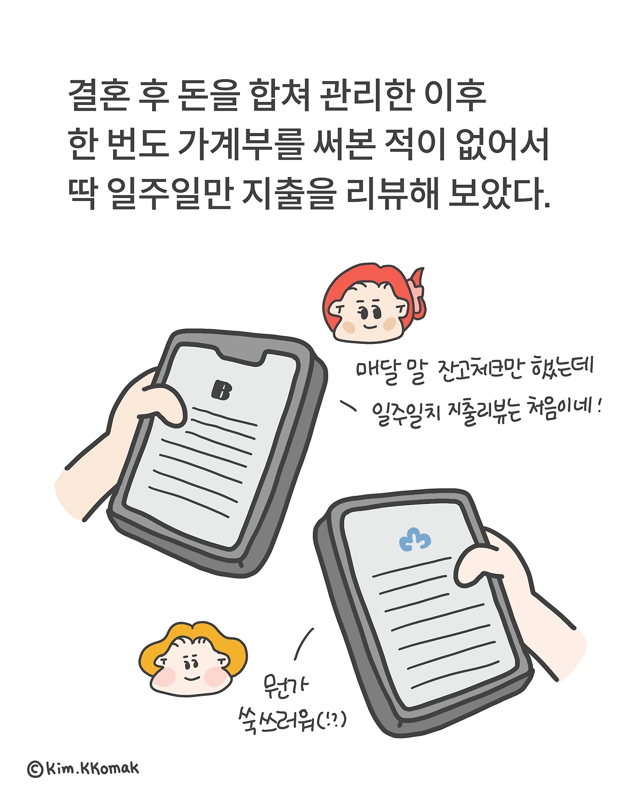 겨우 일주일이었을 뿐인데, 한 번 정리해 보는 것만으로도 소비 패턴이 보이는 게 정말 신기했답니다. 결혼하고 나서는 물론, 저는 그전에도 가계부를 써본 적이 없었기에 더더욱 그랬던 것 같아요.