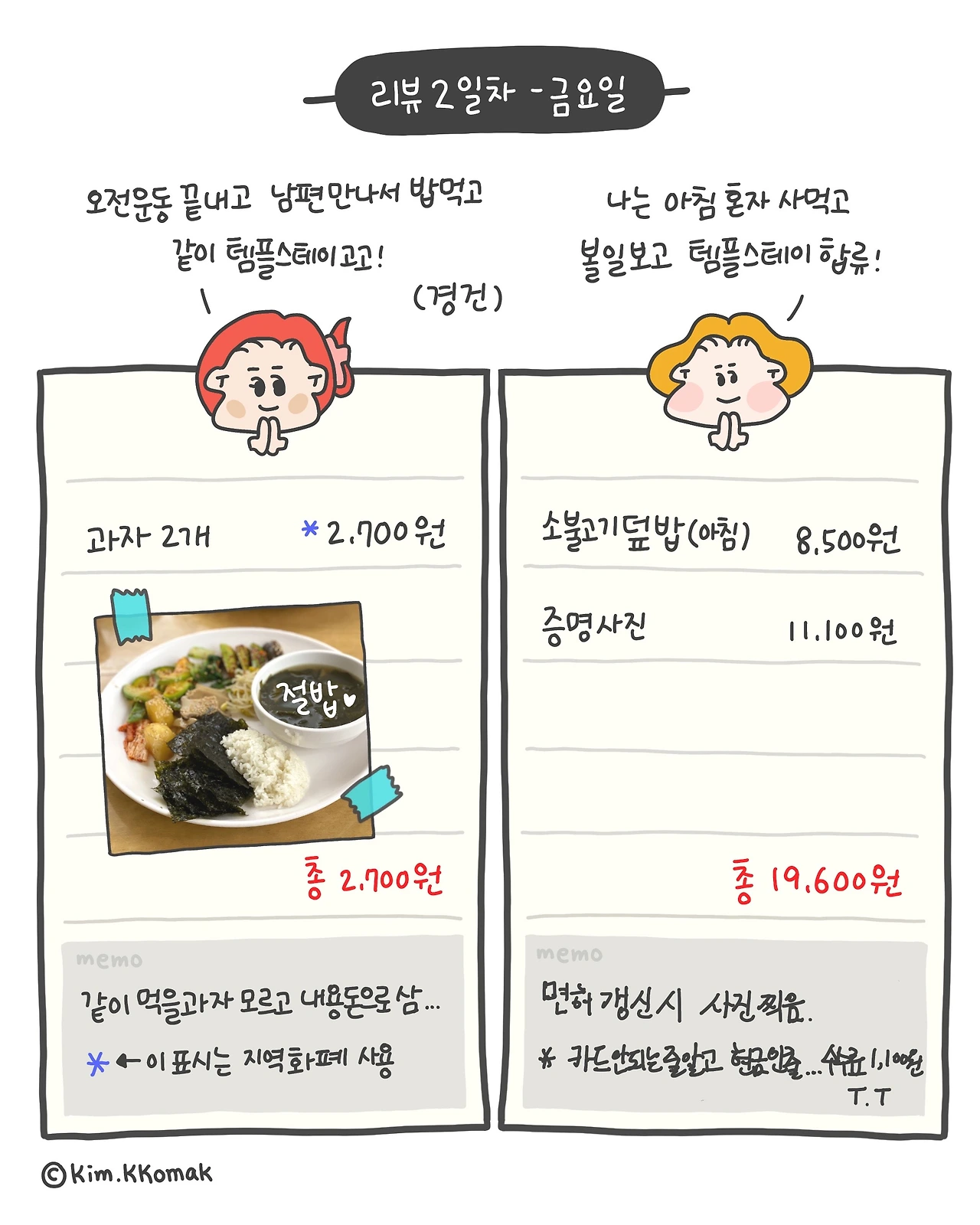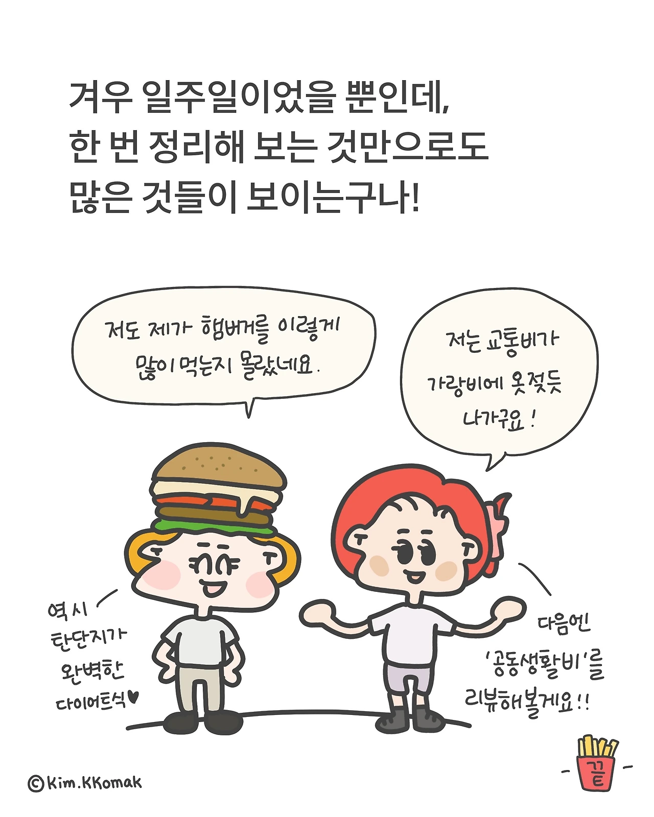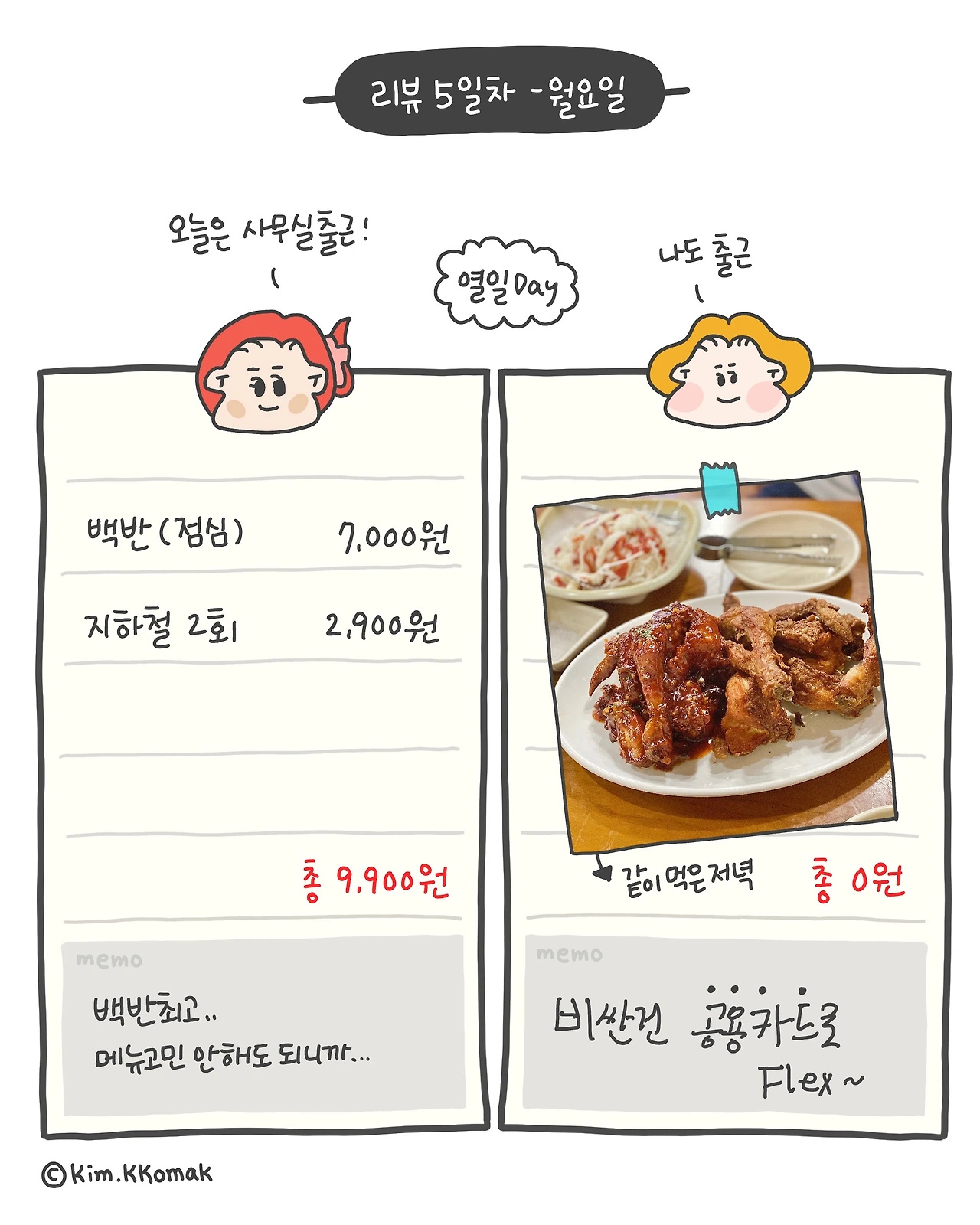 평일 저녁이나 주말에 같이 먹는 식사 비용은 개인 용돈이 아닌 공동 생활비 카드로 쓰기 때문에 이번 지출 내역에서는 볼 수 없지만, 그래서! 다음 화는 같은 기간 동안 ‘부부가 같이 사용했던 공동 생활비’ 지출 리뷰를 해보려고 해요.
