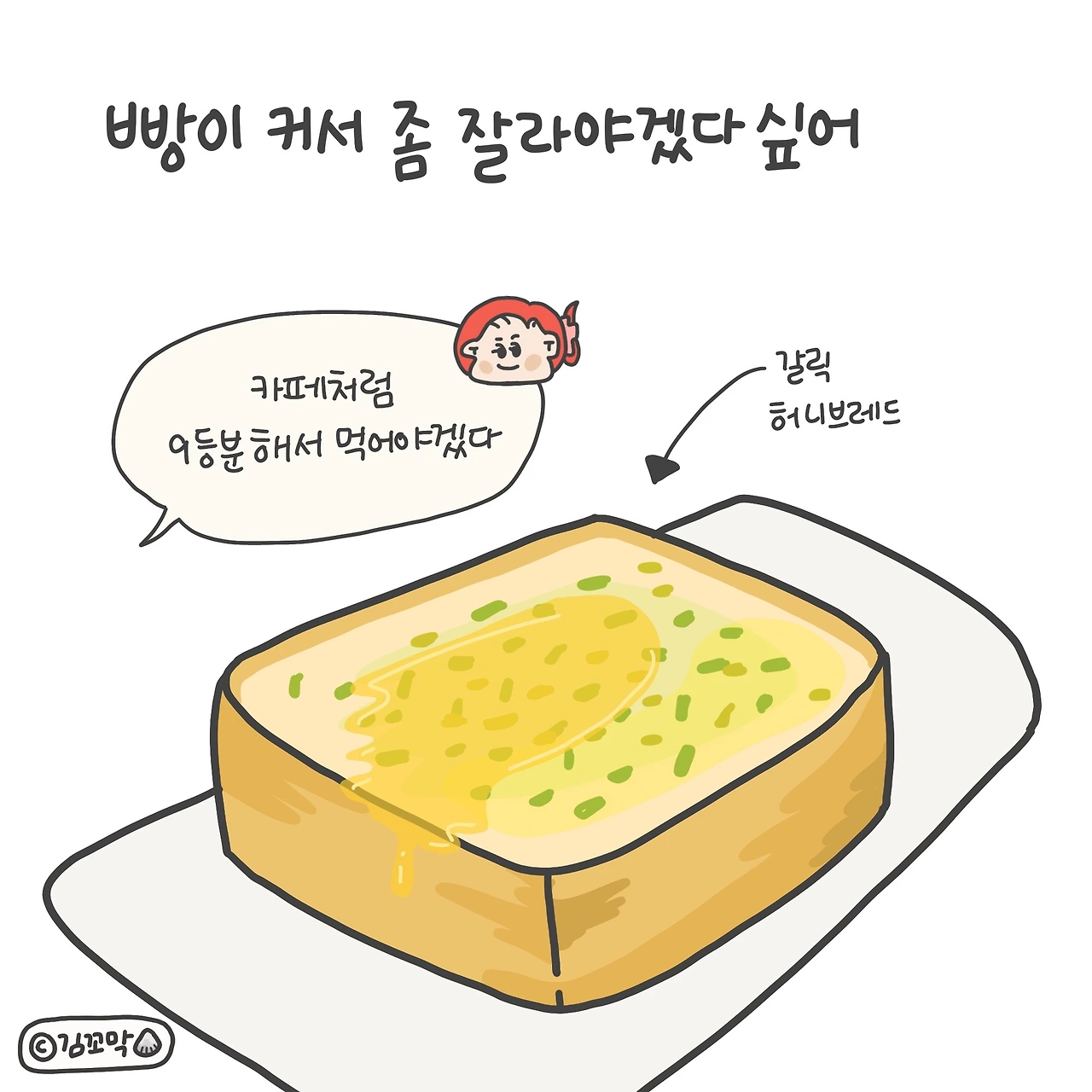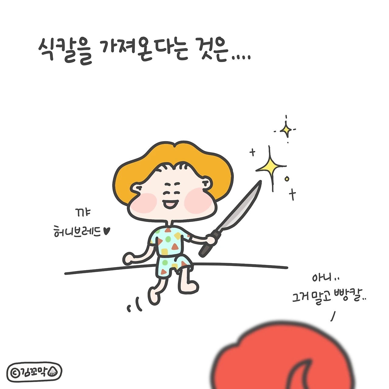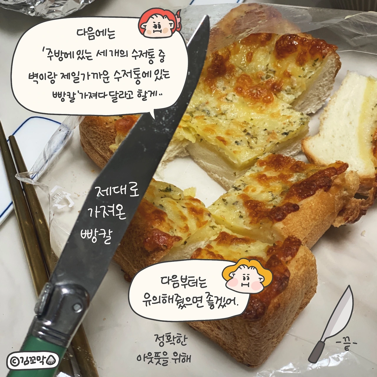 허니브레드를 잘라먹어야겠다 싶어 남편에게 칼 좀 갖다 달라고 했더니, 식칼을 가져온다는 것은.... 공대생에게 입력값을 제대로 입력하지 못한 저의 잘못이겠죠...?