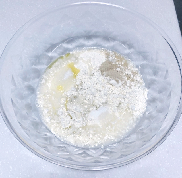 빵 반죽을 하기 위해서 밀가루를 사용해야 하는데, 밀가루에는 3가지 종류가 있습니다. 먼저 가장 일반적인 중력분, 쫄깃함을 주는 강력분, 바삭한 박력분이 있습니다. 글루텐 함량에 따라 나눠서 구분되는데 저는 집에 중력분의 밀가루가 있어서 사용했지만 개인적으로 강력분을 이용하는 것을 추천합니다. 밀가루, 소금, 설탕, 드라이 이스트, 올리브 오일, 미지근한 물을 모두 넣고 반죽을 해줍니다.