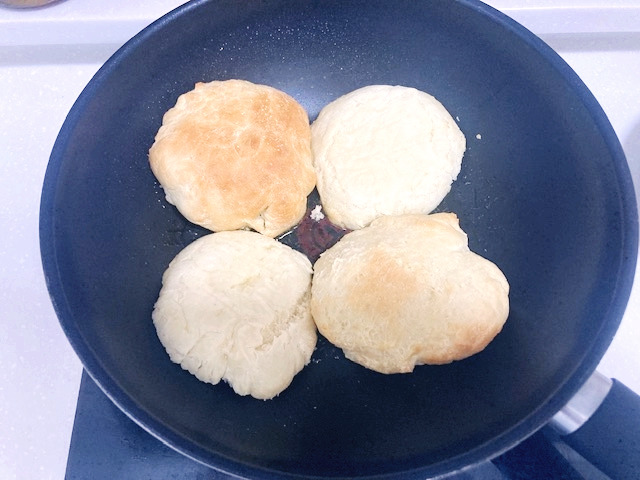 큰 철판이 있다면 빵과 패티를 동시에 굽겠지만, 자취생으로서 냄비도 그릇도 몇 개 없기에 빵과 고기를 차분히 굽도록 하겠습니다. 먼저 빵을 반으로 갈라 구워줍니다. 버터를 넣어서 구우셔도 되고 올리브 오일을 살짝 둘러 중간불에 타지 않게 구워주시면 됩니다. 패티의 경우도 속이 다익을 정도로 구워주시면 됩니다.