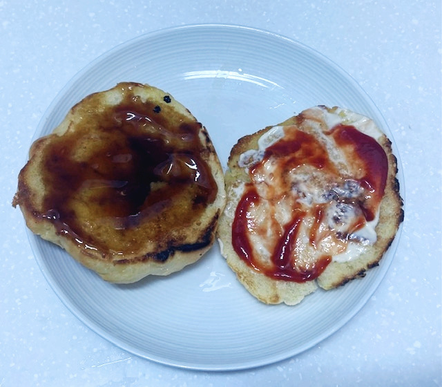 빵이 구워지면 한쪽면에 마요네즈, 케첩을 다른 쪽 면에 데리야끼 소스나 다른 소스를 펴 발라주시면 됩니다. 그리고 토마토 슬라이스 2쪽을 준비해 주시면 됩니다.