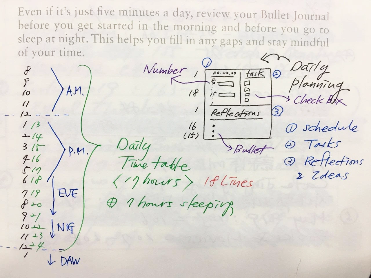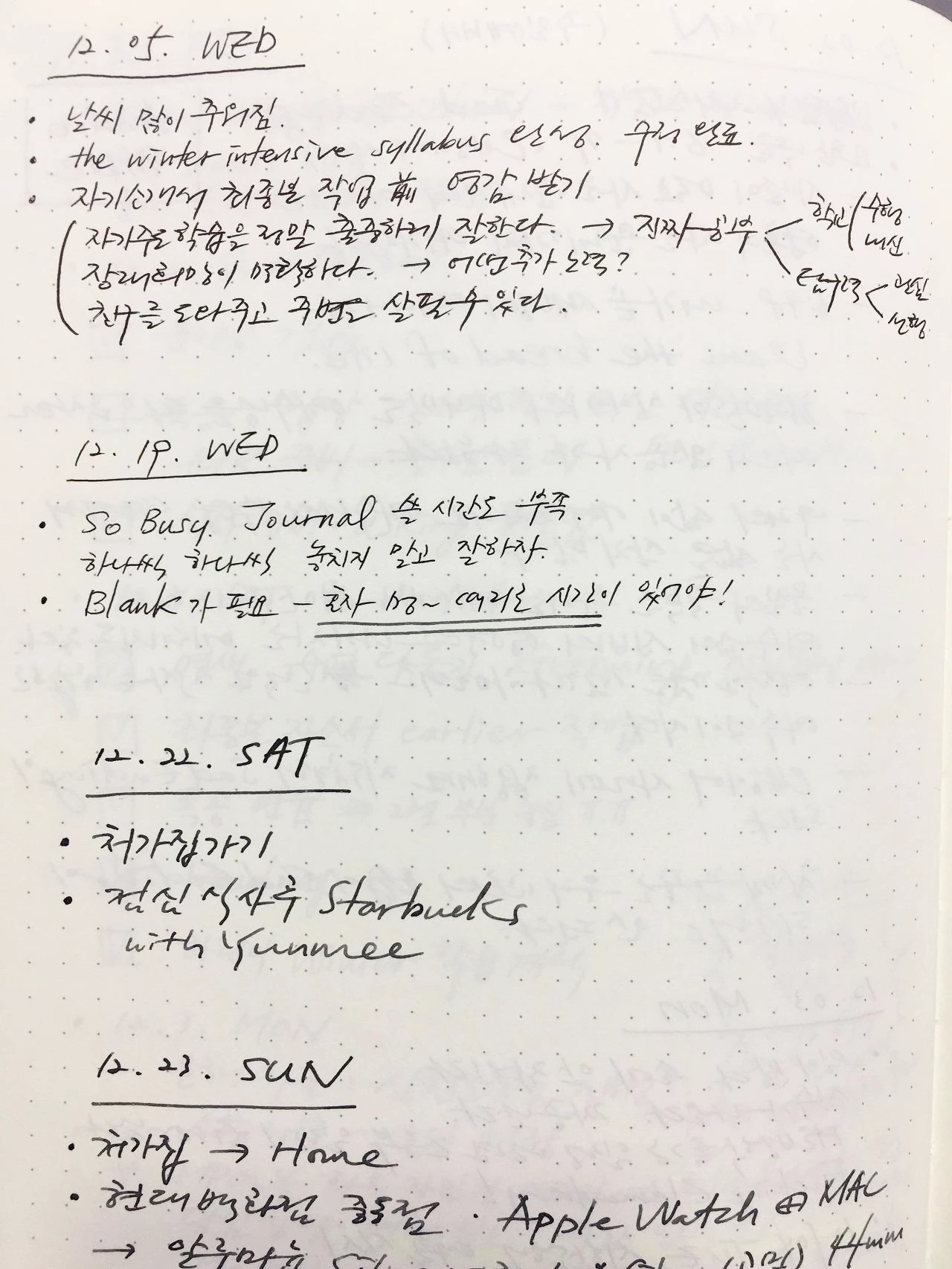 데일리 로그는 매일매일 사용하는 공간이다. 페이지 상단에 날짜와 당일 중요 주제를 기록하고, 하루를 지내는 동안 발생한 당신의 할 일, 행사, 중요한 내용 등을 노트 필기하듯이 기록한다. 끝내지 못한 일은 바로 다음날로 넘겨도 된다. 주의할 점은 일반적인 시간 순서대로 작성하지 말고, 하루를 시작하기 전 또는 하루를 마감한 후 떠오르는 것을 자유롭게 작성하면 좋다.