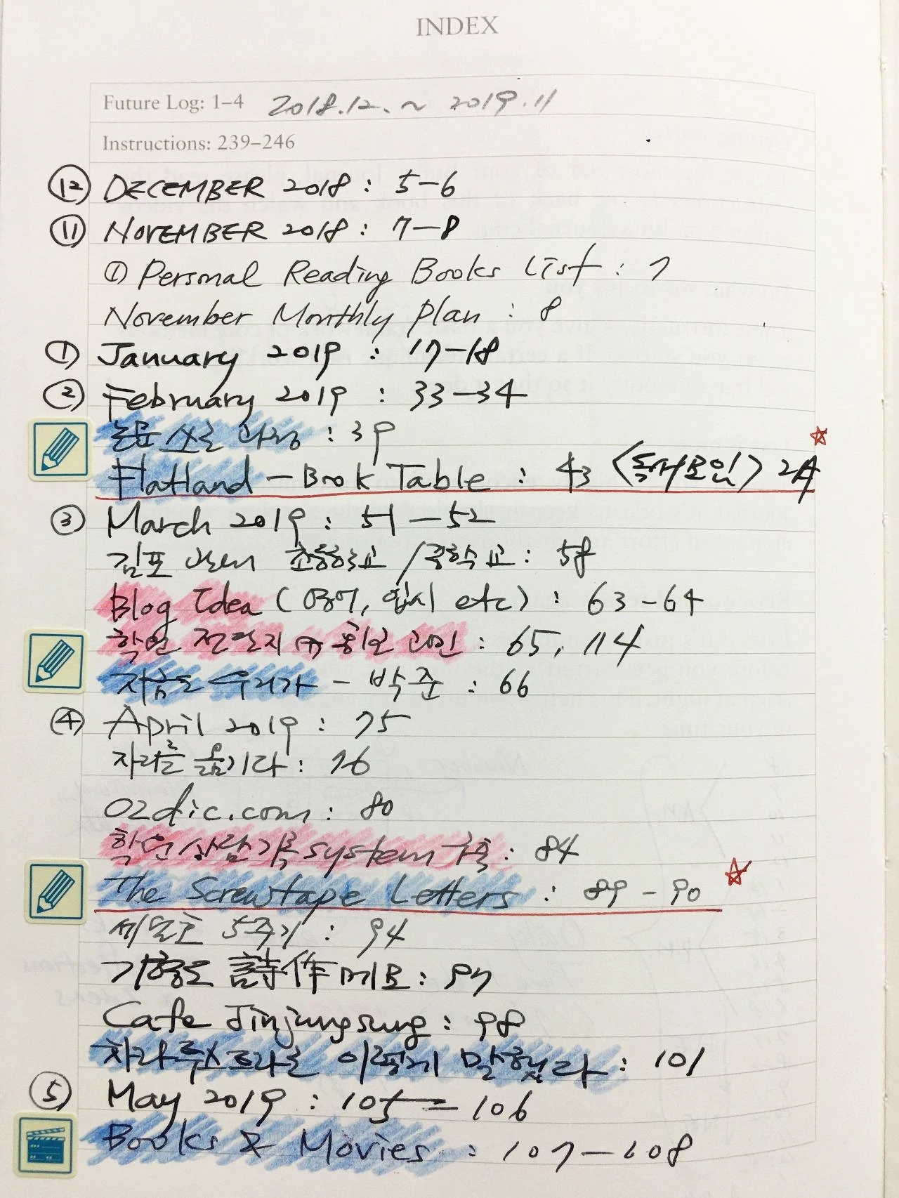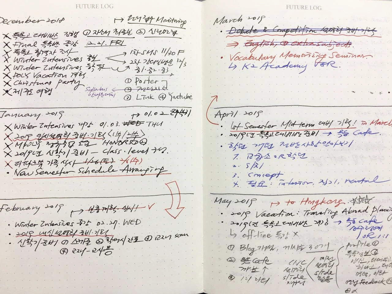 현재 달을 기준으로 향후 6개월의 중요 일정, 할 일, 계획 등을 정리하는 공간이다. 보통 한 페이지에 3개월씩 두 페이지에 걸쳐 작성을 하는 데 본인의 입맛에 맞게 다양하게 꾸미고 작성할 수 있다. 본인의 일을 프로젝트 스타일로 관리하기 때문에 매일 Monthly Log와 Daily Log를 관리하면서 미래에 계획하고 있는 일들을 구체화하면서 실행에 옮기는 데 도움이 될 것이다. 매 달 반드시 Future Log를 다시 보면서 이행하지 못하거나 변경될 일을 다음 달 또는 예정된 달로 이동해야 한다. '이동'은 아래에서 다시 상세하게 설명된다.