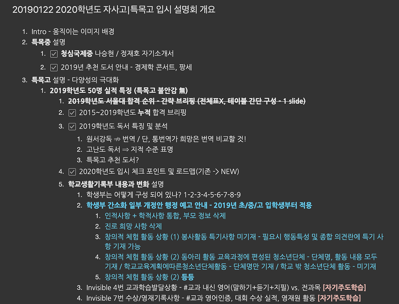 Outliner 아웃라이너는 Top-down 방식의 정리법을 말하며, 학창 시절 노트 필기를 떠올리시면 좋을 것 같습니다. 하이어라키(hierarchy, 위계질서/계층) 개념으로 위에서 아래로 번호와 기호를 매겨 개념과 정의를 서술하는 방식입니다.