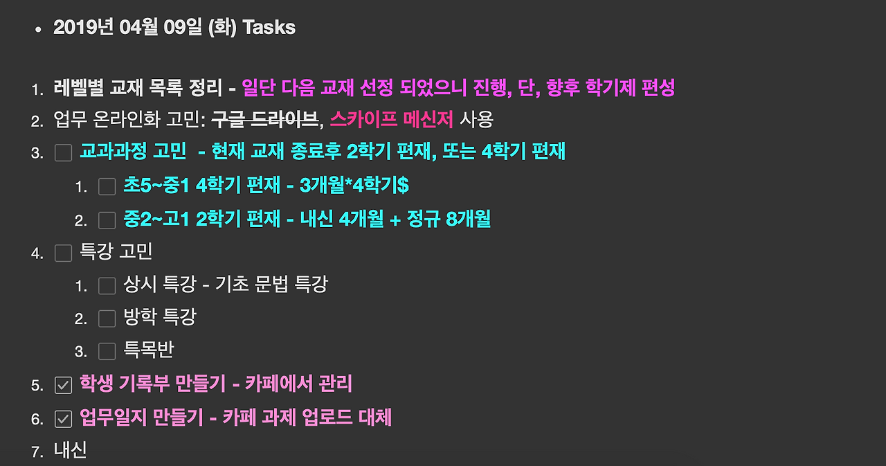 여러 가지 항목을 나열하고, 체크할 항목을 만들 때 쓰는 메뉴입니다. 할 일 정리, 어휘 학습, 관심 리스트, 도서 구매 목록 등 다양하게 사용하실 수 있으며, 미팅 시 체크박스 옆에 참가자 이름을 적어 출석부로도 쓰실 수 있습니다.