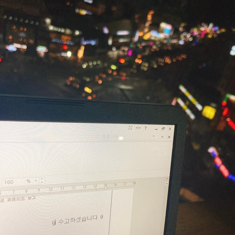 내가 계약한 공유오피스는 로비 자리엔 나름 얼음 정수기도 있고, 통창이 뻥 뚫려있다. 가끔 창가 자리를 찜해놓고 정신없이 일을 하다 고개를 들어보면, 하늘은 붉게 물들어가는 노을을 들키곤 한다. 새까맣게 물든 통창 너머로 퇴근길 차량의 불빛들, 차츰차츰 꺼져가는 가게 간판들을 보면 이상하게 차분해진다.