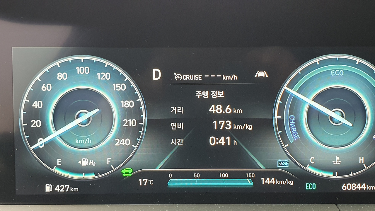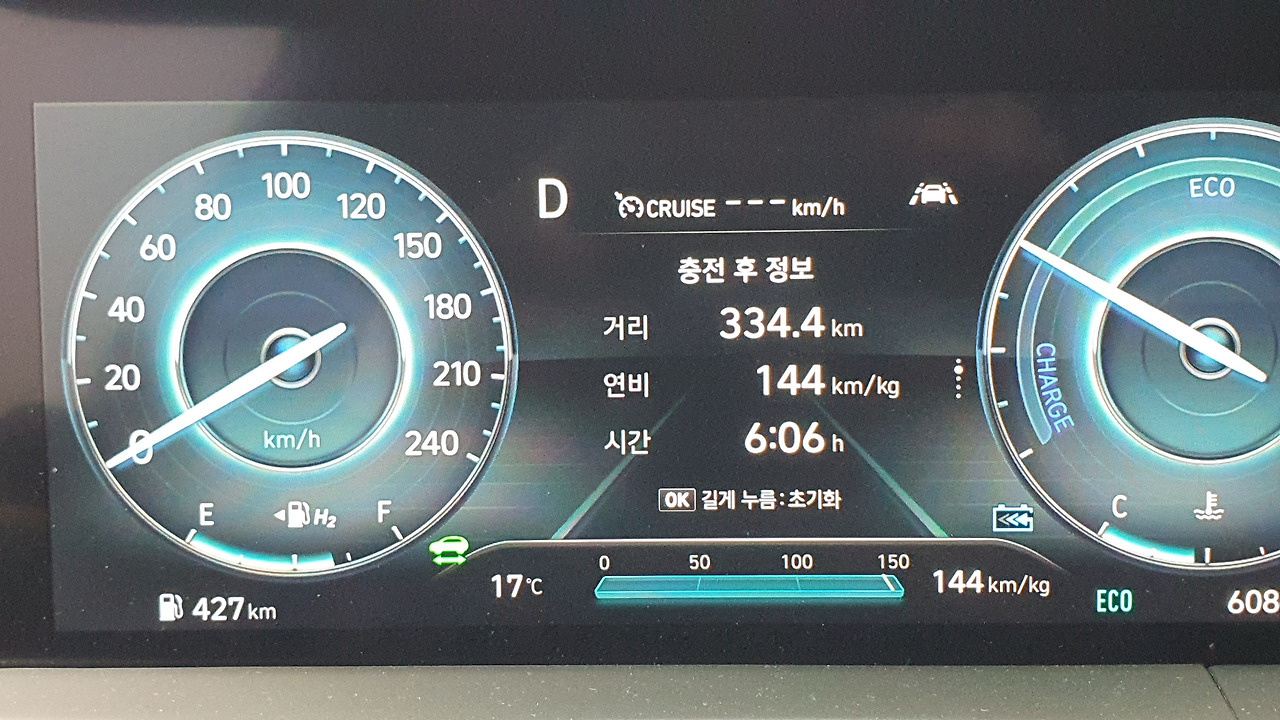 위의 그림에서 보듯 95% 충전에 334킬로를 달렸는데 앞으로 주행가능거리가 427킬로이면 위의 계산대로라면 614킬로를 더 달릴 수 있다. 그러면 95% 충전에 944킬로를 달릴 수 있는 연비가 나온다. 실로 대단한 연비가 아닐 수 없다.