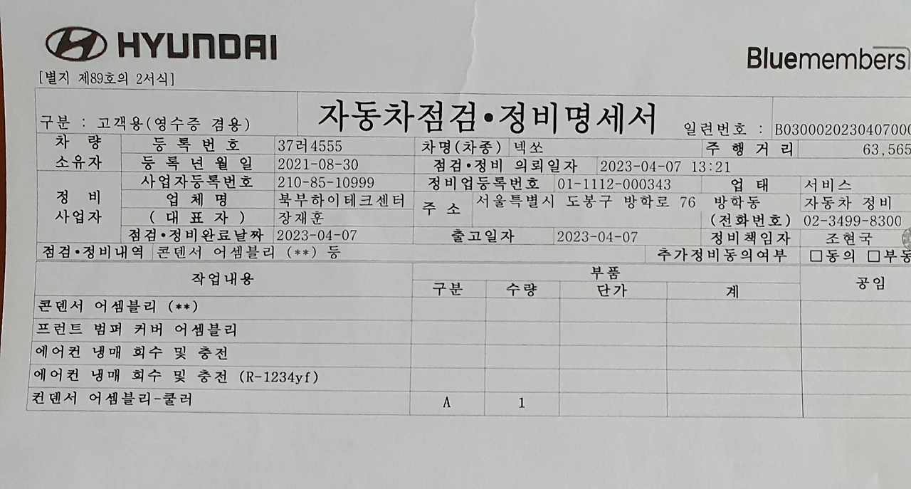 일단은 보류를 하고 현대자동차 서비스 센터에 연락을 해 본다. 에어컨 무상 수리는 3년에 8만 키로까지라며 무상수리가 가능하단다. 블루핸즈에서는 최소 50만 원의 비용이 든다고 했는데 일단 안심이다. 집이 가까운 서울 북부서비스 센터에 예약을 하는데 보름을 기다려야 된다.