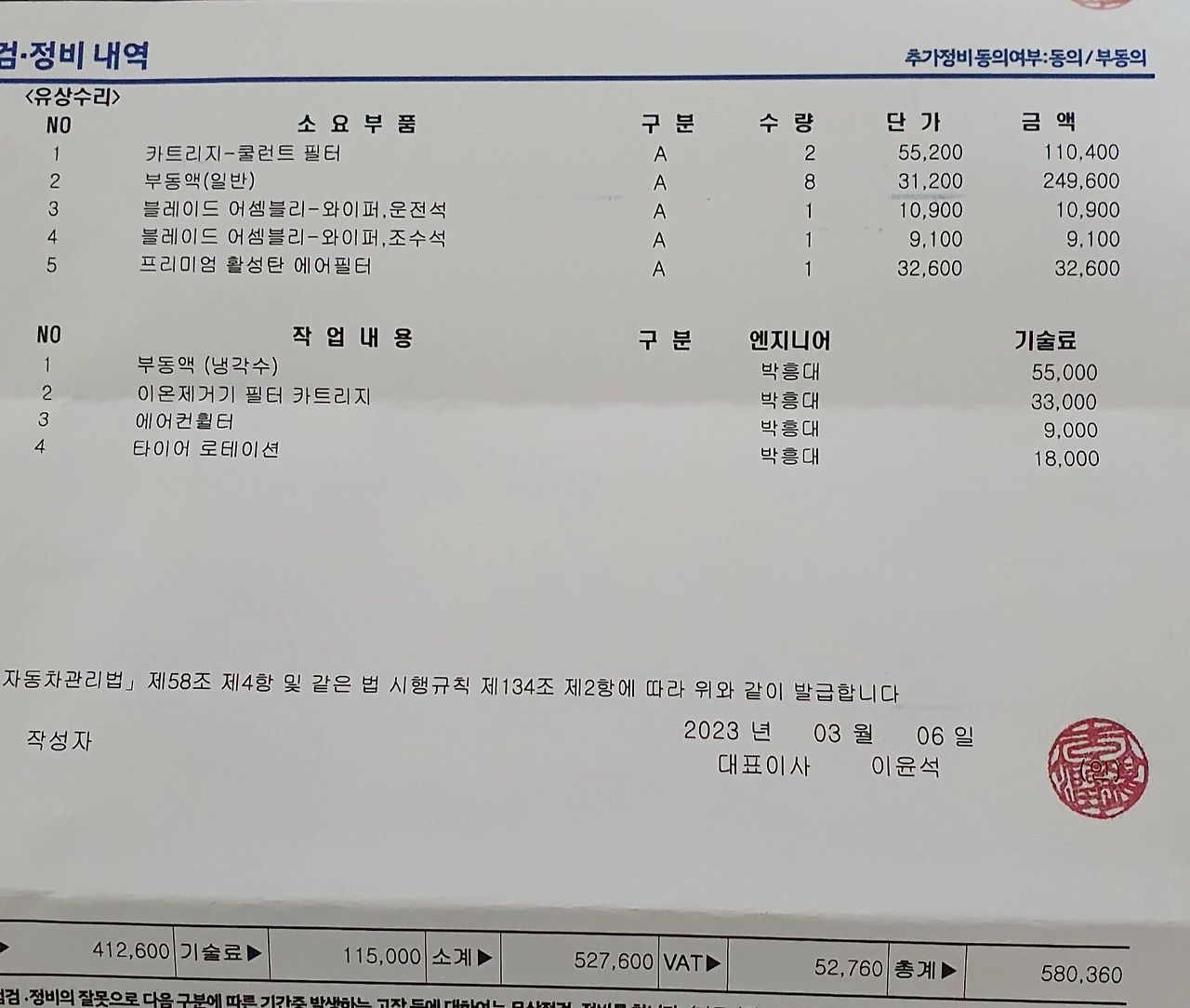 진주 여행 중에 경고등이 떠서 서울로 가려다 일단 진주의 블루핸즈를 찾아 문의를 하니 부동액과 카트리지를 교환해야 한다고 하여 교환을 하였다. 차를 몰면서 가장 많은 비용을 지불하였다. 그러나 어차피 차를 몰고 다니며 당연히 들어가야 하는 경비이니 그러려니 하고 지불을 하고 고쳤다.